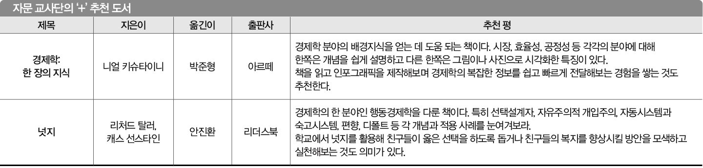 “주변에서 쉽게 만나는 경제 이슈를 소재로 경제학의 개념과 원리를 자연스럽게 터득할 수 있는 책입니다. 용돈이나 아이돌 등 생활과 밀접한 다양한 예시는 청소년들이 스스로 경제 주체로서 자신의 삶과 경제학을 연계해 생각해보게 합니다. 이는 논술·토론·탐구 활동 등으로 이어지기 쉽죠. 또 책은 경제학이 어떻게 발전해왔는지, 주요 사상가들과 이론을 차례차례 짚어주는 한편 인구 절벽, 양극화, 가계 부채 등 지금 우리 사회를 흔들고 있는 주요 현상을 경제학적 측면에서 분석합니다. 읽다 보면 자연스레 <경제> 개념은 물론 다른 사회탐구 영역의 개념·이슈들을 폭넓게 접할 수 있다는 점도 이 책의 강점입니다.”