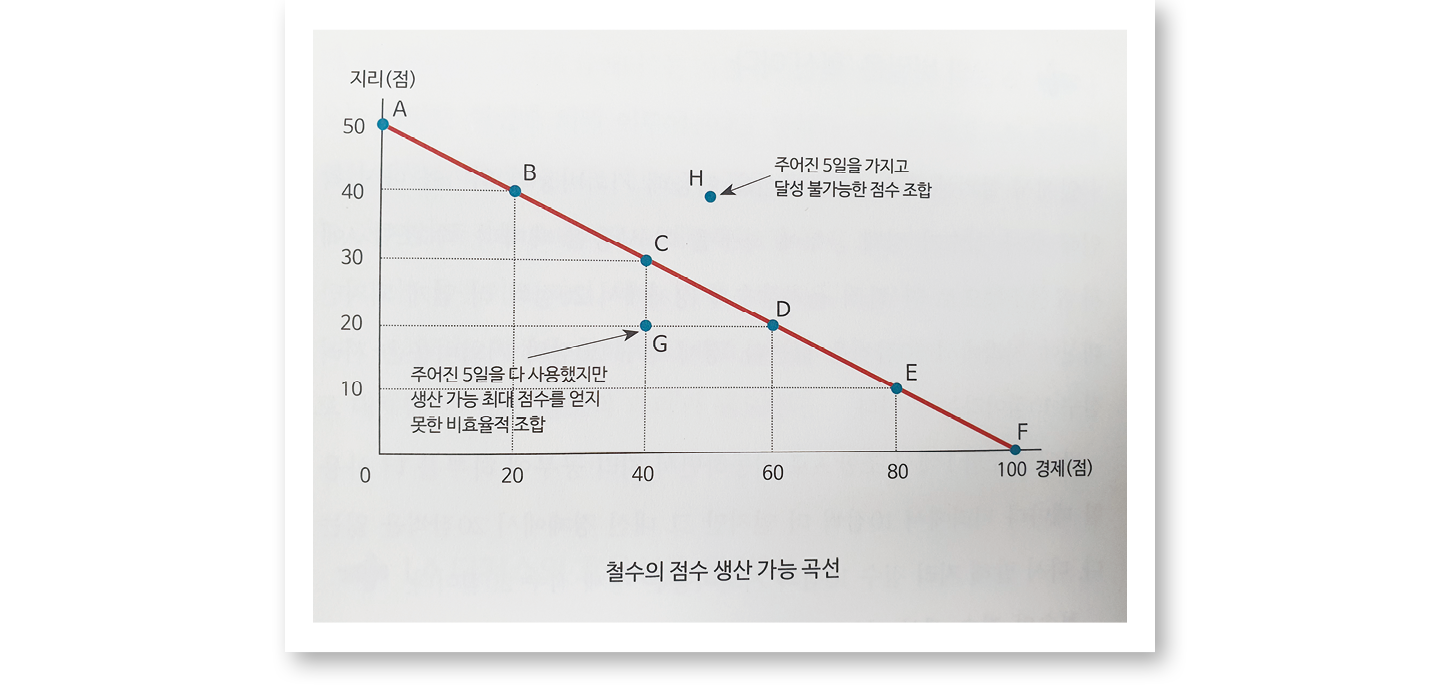 예를 들어 ‘효율성’ 개념은 시험 공부로 설명한다. 공부 시간과 점수 사이에 상관관계가 있음을 가정하고, 두 과목의 공부 일수에 따른 성적을 표로 정리해 그래프로 그렸다. 한눈에 가장 많은 점수를 얻을 수 있는 과목별 공부 시간 조합을 찾아내고, ‘생산 가능 곡선’을 이해케 한다. 같은 방식으로 소비자·생산자 잉여, 한계효용, 경제적 지대 등의 개념을 판매처에 따라 다른 컵라면 가격, 독서실 1일 요금이 가장 비싼 이유, 아이돌을 꿈꾸는 이들이 늘어나는 배경 등의 사례로 설명한다. ‘경제적 사고’를 반복해 접하면서, 경제학에서의 수학의 쓸모와 편의도 체감한다. 양극화, 인플레이션, 실업, 가계 부채, 자유·보호무역 등 오늘날의 사회 문제도 알게 된다.