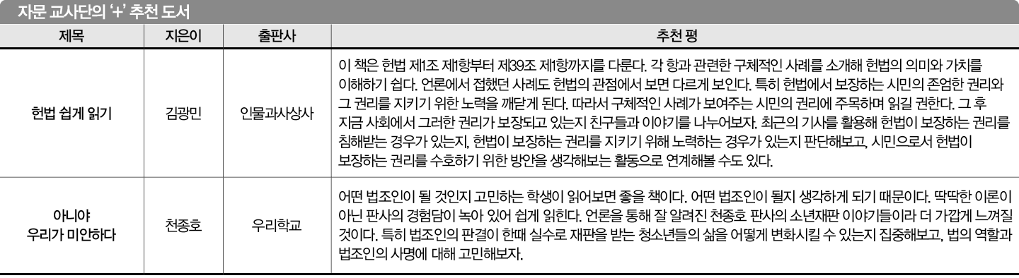 “이 책은 갑질 최저인금 CCTV 학교폭력 등 우리 사회의 24가지 법정 다툼을 시장 질서, 공정한 계약, 개인의 자유와 권리, 삶과 죽음, 청소년, 사회적 약자, 환경 갈등 등 7개의 장으로 정리해 소개합니다. 상반된 당사자들의 입장을 고루 살펴 분쟁의 쟁점을 찾고, 합리적인 해결책을 스스로 생각해보도록 이끌죠. 각 장마다 ‘법정드라마’ 코너를 따로 둬 익숙한 영화·드라마의 에피소드로 법의 논리를 살펴보도록 소개하는 점도 흥미롭습니다. 독서 연계 활동으로 책의 24가지 재판 중 흥미로운 주제를 찾아 최종 판결과 현재 진행 상황을 살펴보고, 자신의 생각을 뒷받침할 법적 근거를 찾아 발표해보는 것도 좋겠습니다.”