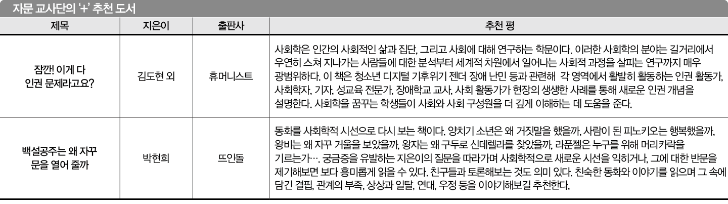 사회학은 폭이 넓다. 때문에 책은 ‘교육’ ‘자본주의’ ‘과학’ ‘지속가능한 발전’ ‘의료학’ 등의 개념도 다룬다. 다른 진로를 꿈꾸는 학생들도 관심 분야와 사회의 관계를 돌아볼 수 있어 읽어볼 만하다.