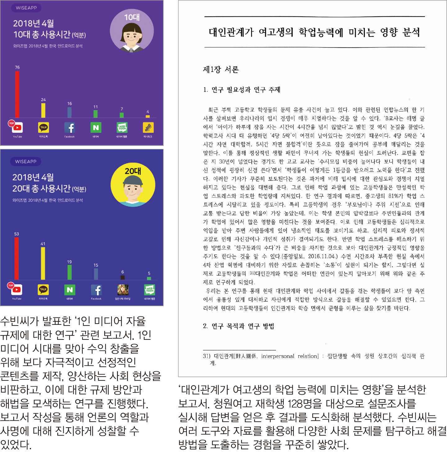 “평소에 사회 문제나 경제, 정치 상황에 관심이 많은 편이어서, 제 적성에 맞는 진로를 잘 찾았다고 생각했어요. 사람들의 관심을 끄는 뉴스와 기사를 친구들과 공유하는 것도 즐거웠죠. 자연스럽게 학교 활동도 독서나 토론, 백일장, 논문이나 보고서 작성 등 인문사회 분야로 초점을 맞춰 진행하게 됐고요.”