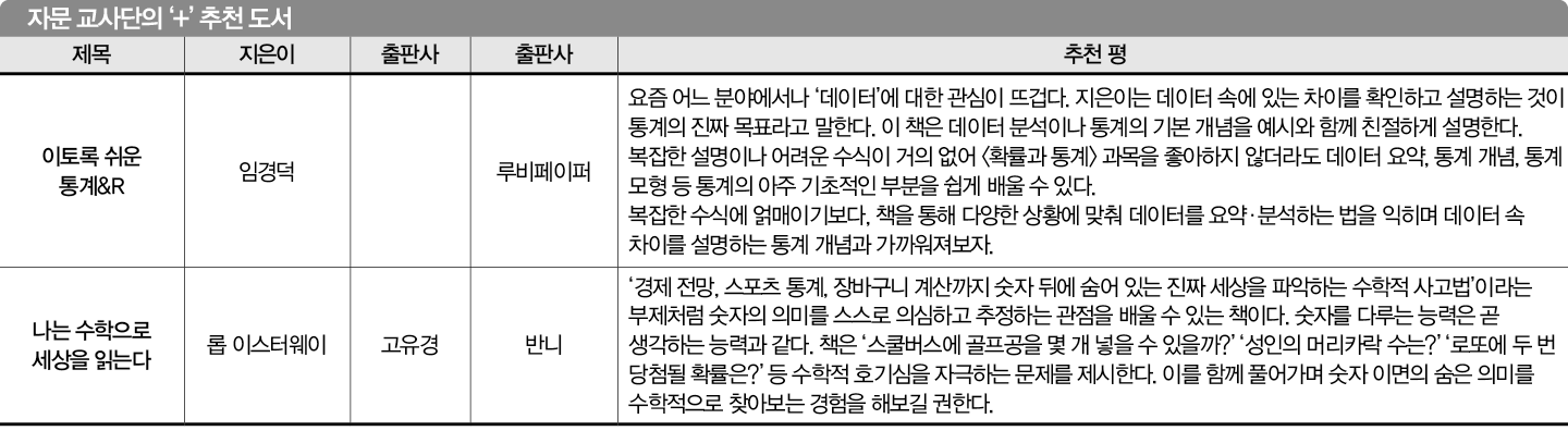 책을 읽은 후 데이터를 직접 다뤄보길 추천한다. worldometers(www.worldometers.info/kr)나 국가통계포털(kosis.kr) 등에 공개된 데이터로 저출생, 기후 위기, 자원부족 등 본인의 관심 분야나 현재 이슈로 부상하는 문제를 분석하고 대안을 모색해보는 것. 통계와 데이터를 더 깊게 이해하고 수없는 숫자의 향연에서 숨겨진 세상을 찾아내거나, 몰랐던 이면을 들춰내는 경험을 할 수 있다. 또 경영·경제·사회 현상이나 인간 심리를 분석할 때도 통계가 쓰이는 만큼, 상경 계열이나 사회과학 분야에 관심 있는 학생들에게도 유용한 책이다.