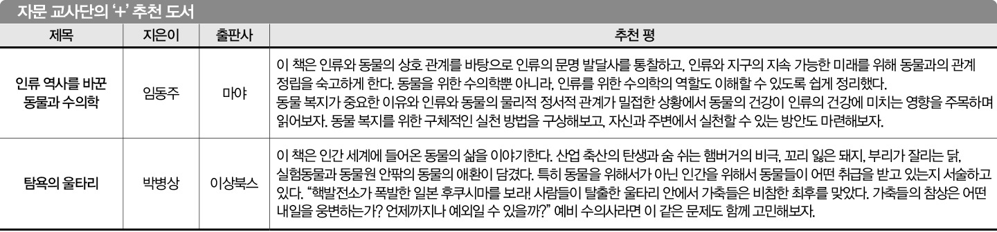 수의사인 아버지가 딸의 질문에 답해주는 형식으로 구성된 책입니다. 설명이 친절하고 이해하기도 쉽죠. 무거운 소재를 다루는데도 편하게 다가온 책입니다. 지금의 인류는 다양한 형태로 동물과 관계를 맺잖아요. 가족이 되기도 하고 또는 먹기도 하죠. 이윤 추구를 위해 동물이 동원되기도 하고요. 이런 고착화된 관계에 의문을 제기하는 책입니다. ‘이게 과연 바람직한가?’라고요. 잘 드러나지 않지만 엄연히 존재하고 있는 동물 학대도 다루고요. 수의예과 진학을 꿈꾼다면 동물을 좋아하는 데 그치지 않고, 이런 현실을 직시해야 한다고 생각했습니다. 해결하지는 못해도, 고민하는 자세와 경험도 중요하니까요.