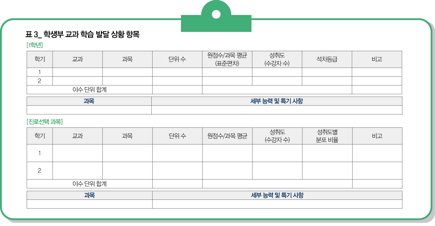 대학에서는 물론 고교에서도 2024학년 학생부종합전형의 관건은 세특이 될 것이란 관측이 나오고 있다. 세특은 학생부의 ‘교과 학습 발달 상황’ 항목에서 담당 교사가 학생을 관찰한 후 수업 태도나 역량, 교과와 연계해 수행한 활동을 기록한 것이다(표 3). 세특은 대학이 교과 성적 외에 학생의 학업 역량과 학업 의지, 탐구 역량, 성실성 등을 살필 수 있는 대표적인 자료다. 또한 세특은 모든 과목에 기록되기 때문에 대학은 학생의 전체적인 학습 태도를 관찰할 수도 있다.