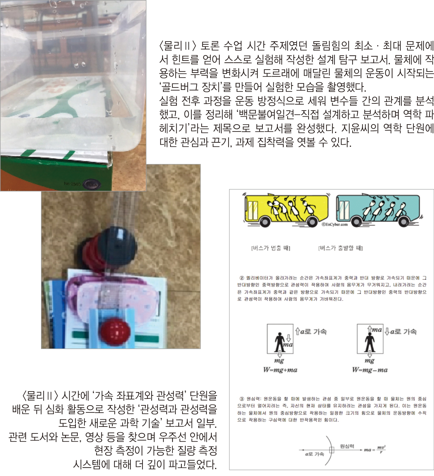 토론 형식으로 진행된 <물리> 수업에서 지윤씨가 특히 흥미를 느낀 내용은 ‘일-에너지 정리의 증명’에 관한 것이었다. 수업 시간에는 일정한 힘과 관련된 문제만 다뤘기 때문에 등가속도 공식을 이용했지만, 우리 실생활에서는 일정하지 않게 작용하는 힘이 더 많다는 생각이 들었다. 더 공부해보고 싶다는 마음이 꿈틀거렸다.