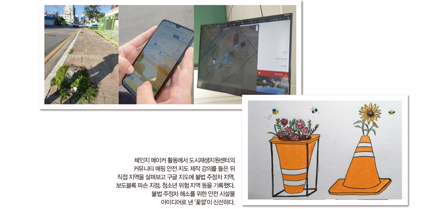 ‘꽃깔’의 탄생 마침 이 생각을 실제로 구현해볼 수 있는 기회가 생겼다. 3학년 전체 학생들이 참여하는 ‘체인지 메이커’ 활동의 목표는 주변에서 발생하는 문제를 찾아 직접 해결해보는 것. 팀장을 맡은 현수씨는 ‘도로 교통 문제 개선’을 주제로 지역 내 안전 지도를 만들어 배포하는 활동을 제안했다.