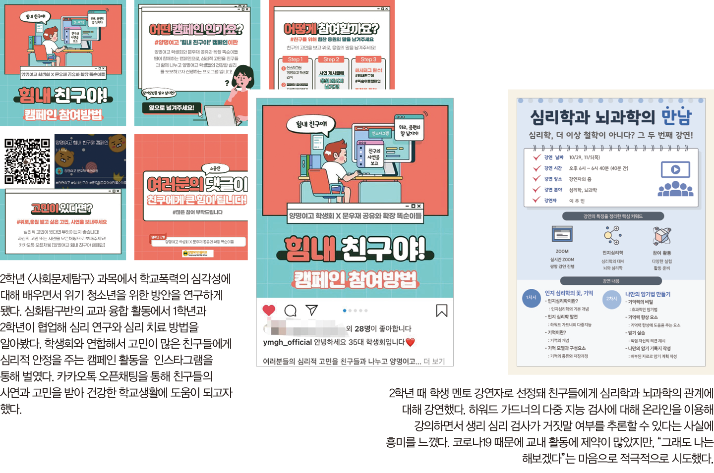“그래도 비대면으로, 온라인으로 할 수 있는 활동을 찾아서 했어요. ‘침묵의 나선 이론’ 실험도 온라인으로 하고, 친구들과 후배들을 초청해 학생 멘토 강연을 하는 등 어려운 상황을 극복해보려고 애썼어요. 덕분에 고2와 고3 때 심리학 관련 활동이 집중적으로 많아졌더라고요. 수업 시간에도 마이크를 켜 적극적으로 질문하고 제 화면을 공유하면서 발표했어요.”