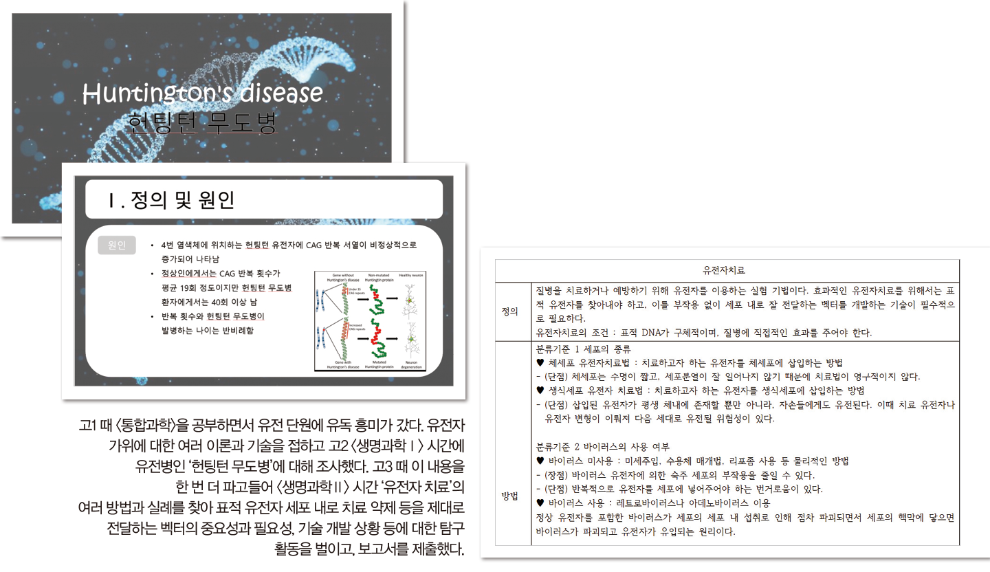 “유전자 핀셋을 통해 세상을 바꾸는 아이디어는 다양한 분야의 학문을 융합할 수 있는 시각과 지식에서 비롯된다고 생각했어요. 생명과학 원리에 바탕을 둔 새로운 의학 기술이 대중화되려면 수술이나 약 혹은 의료 기기 등으로 구현돼야 하는데 이는 물리학 화학 수학 등 인접 학문을 활용해야 해서 저도 서로 다른 과목을 연결지으려 애썼어요. 교과 개념을 심화하면서 관심 분야에 대한 이해의 폭을 넓힐 수 있었죠. 여러 과목 수업과 동아리 등 창체 활동을 엮을 수 있어 탐구 활동을 보다 효율적으로 할 수 있었고요.”