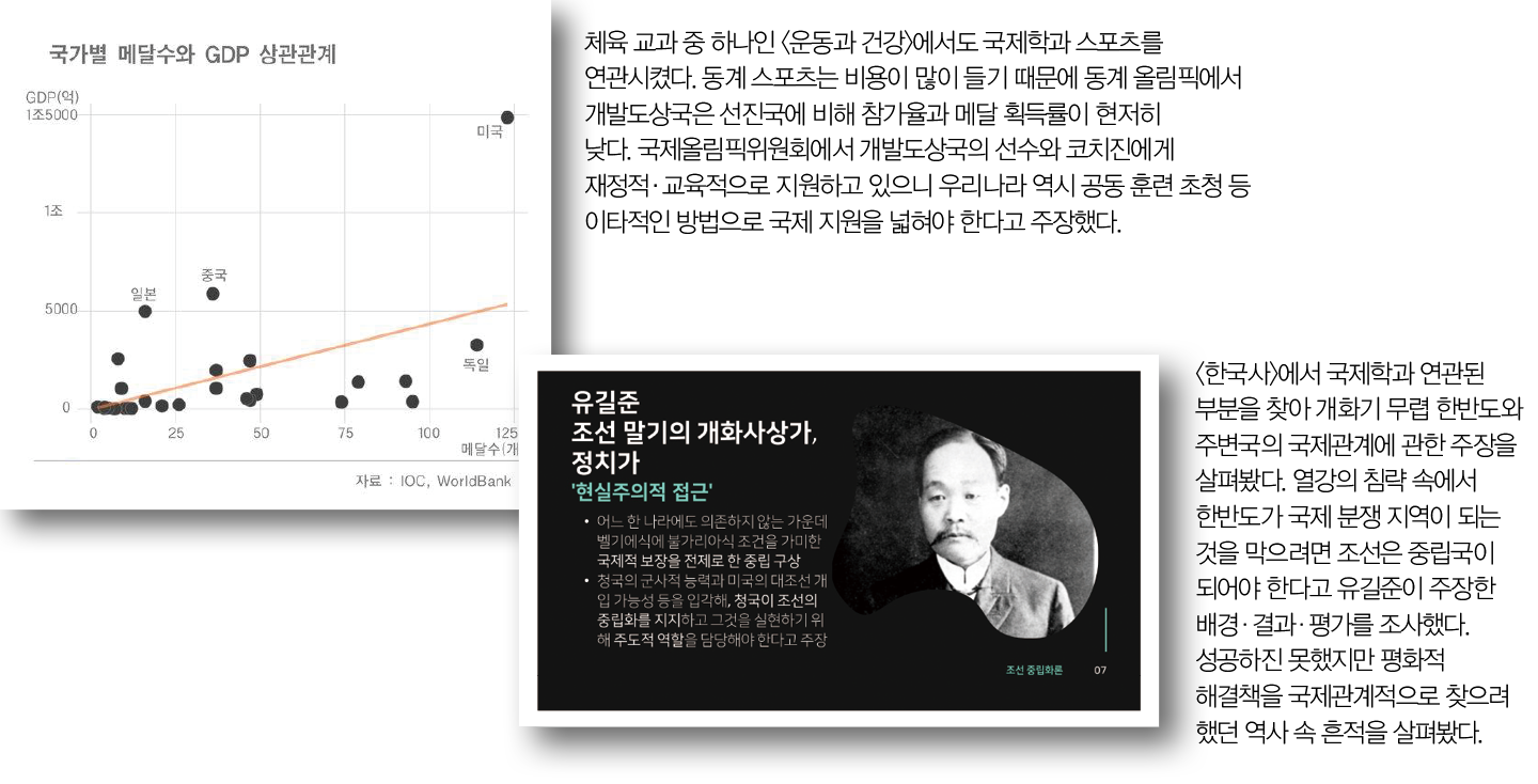 한 우물 현우씨는 많은 과목에서 국제학에 관한 열정을 일관되게 보여줬다. <사회문제탐구>에서 코로나19 백신이 선진국에 집중되는 바람에 국제적 불평등이 심화됐다는 점을 지적, 이를 해소시킬 방안을 모색했다. <심화영어Ⅱ>에서 온실가스 감축을 의무화한 교토 의정서를 탐구하며 선진국이 탄소 배출권을 사들이는 것은 면죄부를 사는 것과 같음을 국제관계학적으로 바라봤으며, 대안을 찾아 다른 나라의 사례를 알아봤다.