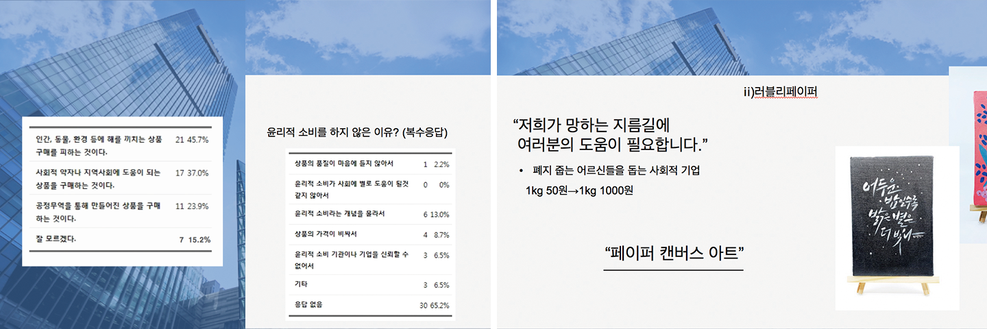 3학년 <논술> 수업에서 발표한 ‘청소년의 윤리적 소비 인식과 사회적 기업’ 자료.