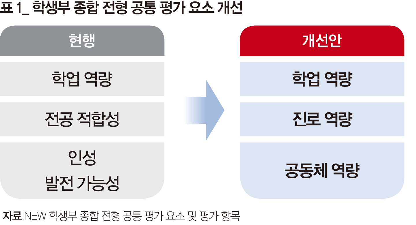 지난 2022년 건국대 경희대 연세대 중앙대 한국외대 등 5개 대학이 ‘학생부 종합 전형 공통 평가 요소 및 항목 개선 연구’ 보고서와 <New 학생부 종합 전형 공통 평가요소 및 평가 항목> 소책자를 펴냈다. 2017년 같은 이름의 보고서와 비교하면, 종합 전형의 평가 요소를 학업 역량, 진로 역량, 공동체 역량 등 3개로 조정했다. 종전의 인성과 발전 가능성을 ‘공동체 역량’으로, 전공 적합성을 ‘진로 역량’으로 변경했다. 2024학년 대입부터 적용되며 일부 대학·전형에서는 2023학년부터도 활용됐다.