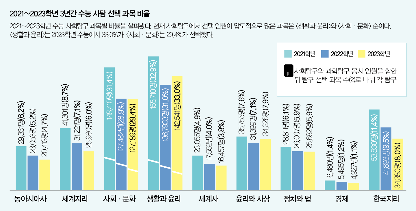 탐구는 공부하면 수능에서 점수를 올리기 쉬운 영역이지만, 어떻게 출제되느냐에 따라 등급 컷이나 표준점수가 널뛰는 영역이다. 9월 모의평가까지 안정적인 1~2등급을 받다가도 수능 당일 3~4등급으로 확 떨어져 간담을 서늘하게 만드는 과목이기도 하다. 보통 수시에서는 수능 최저 학력 기준을 맞출 때 탐구 한 과목을 활용하는 경우가 많고, 정시에서도 탐구 반영 비율이 높은 편이라 수시와 정시를 막론하고 중요하다. 특히 2023 수능에서는 사회탐구 난도가 급격하게 높아져 수학 못지않게 탐구가 대입 변수로 작용했다. 높아진 탐구 반영 비율과 난도 등 변화하는 대입 환경에서 사회탐구의 과목별 특징과 수능 선택 비율의 변화, 수능과 교육과정에서의 선택 기준을 살펴봤다.