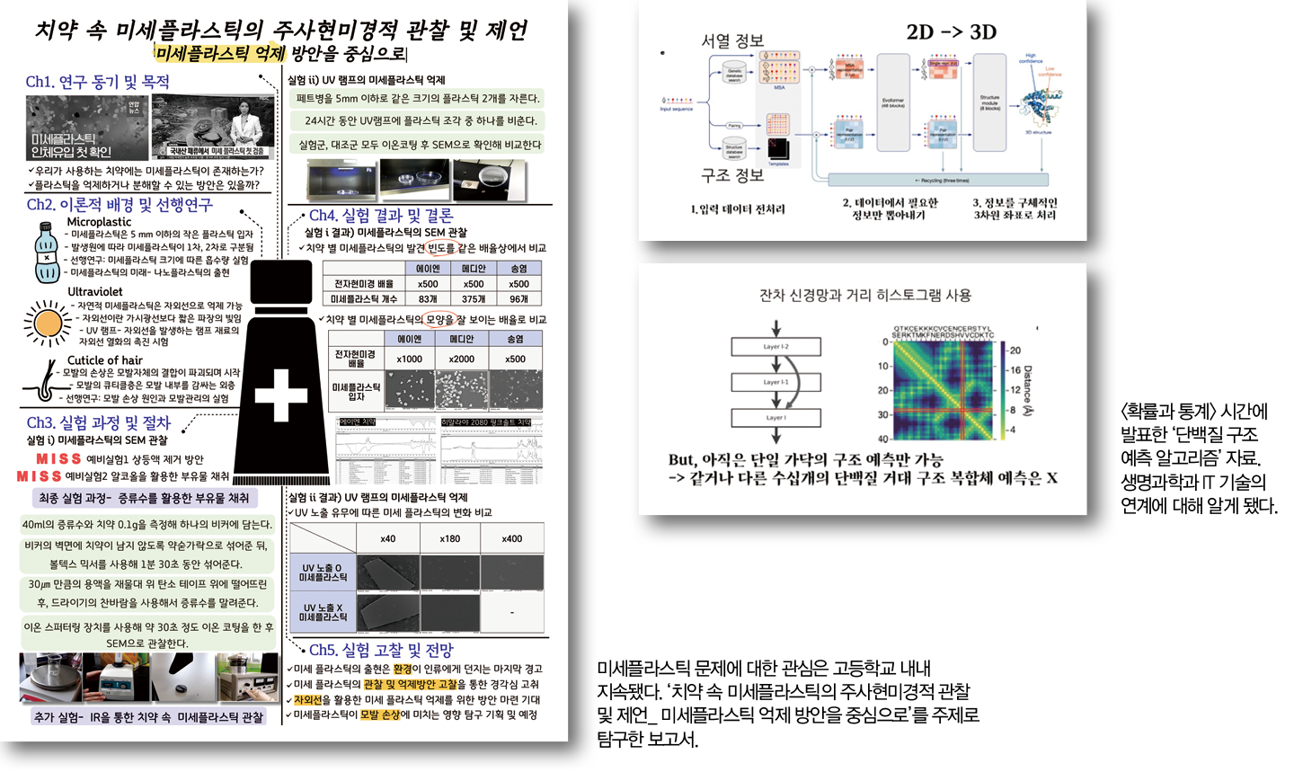 <통합사회> 지역 사회의 문제점으로 해수욕장에 버려지는 페트병을 지적, 다른 나라에서 진행하는 플리스틱병 반환 제도 등을 조사해 도입 제안 <통합과학> 코로나19 치료제 후보군과 백신 개발 현황에 대해 조사·발표, <침묵의 봄>을 읽고 환경 문제에 대해 고민 <기술·가정> 생명공학 분야에서 유전자 가위의 발전과 한계점에 대해 소개, IT 기술의 딥러닝 알고리즘을 통해 이를 극복하는 과정에 대해 발표, 미세플라스틱을 주제로 디자인 싱킹 진행