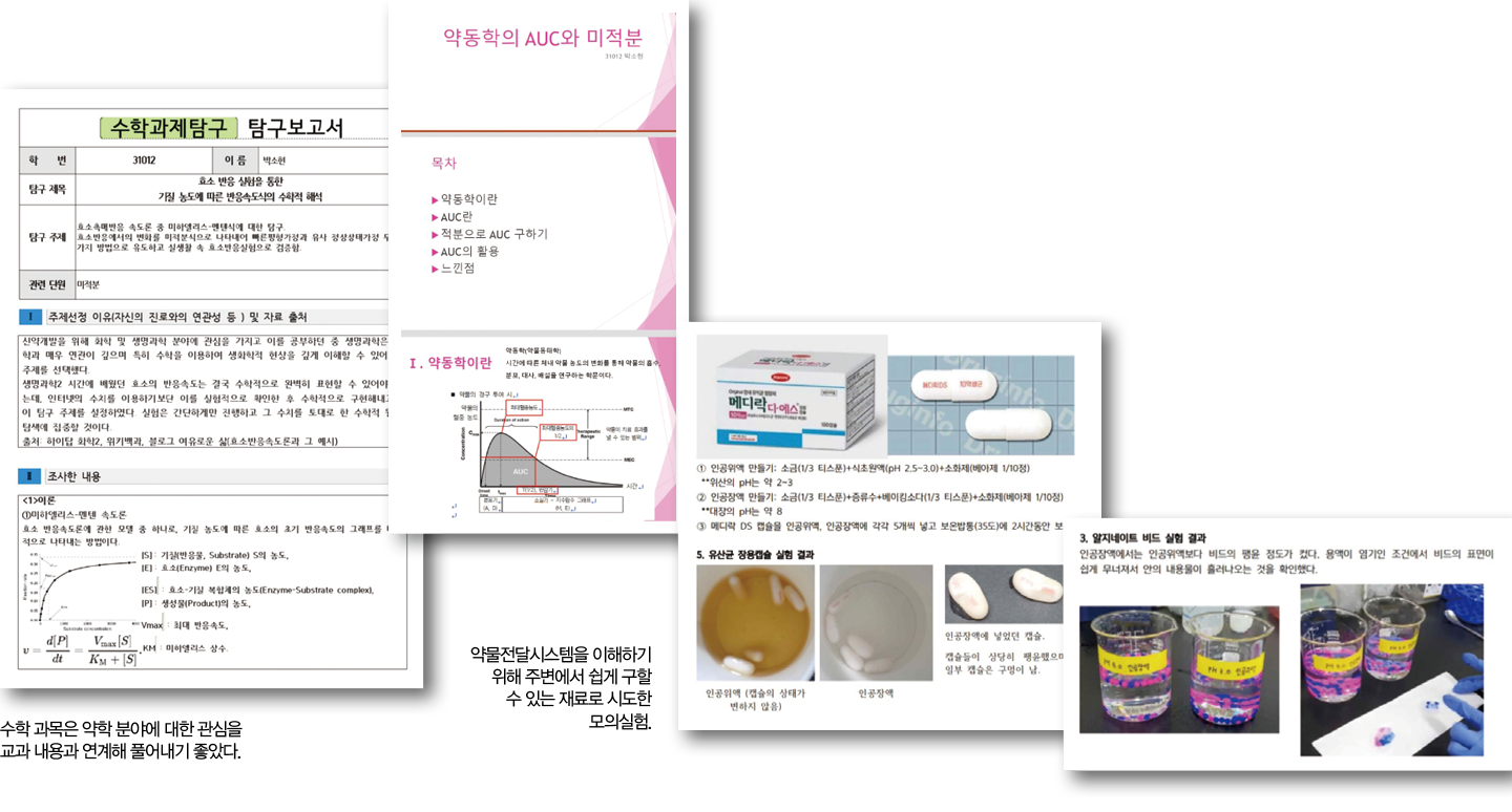 <독서> 인체의 면역계를 구성하는 세포들과 장내 미생물에 대한 지문 분석, 관련 도서 <우아한 방어>를 지문과 비교 <수학Ⅰ> 약물의 반감기에 대한 자율 탐구 활동 진행, 지수함수로 나타나는 아세트아미노펜 혈중농도 그래프와 약동학에 관해 조사 <물리학Ⅰ> 수학 심화 탐구 활동 중 알게 된 ‘뉴턴의 냉각법칙’을 열역학과 연관 지음 <생명과학Ⅰ> 감염성 질병의 원인을 찾는 모의 활동 수행 <정보> 약 장기복용 환자를 위한 알약 디스펜서 제작 설계 <기하> 3차원 모델링과 팅커캐드의 3차원 툴을 이용해 아스피린 분자 3D 모델을 만드는 과정 조사