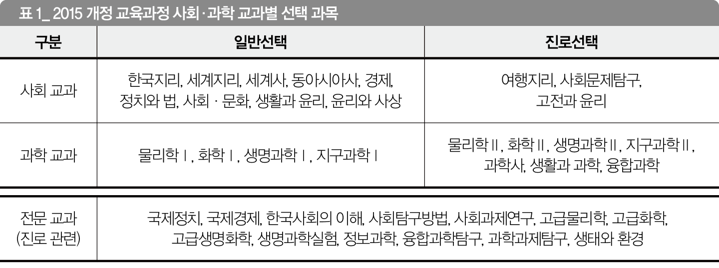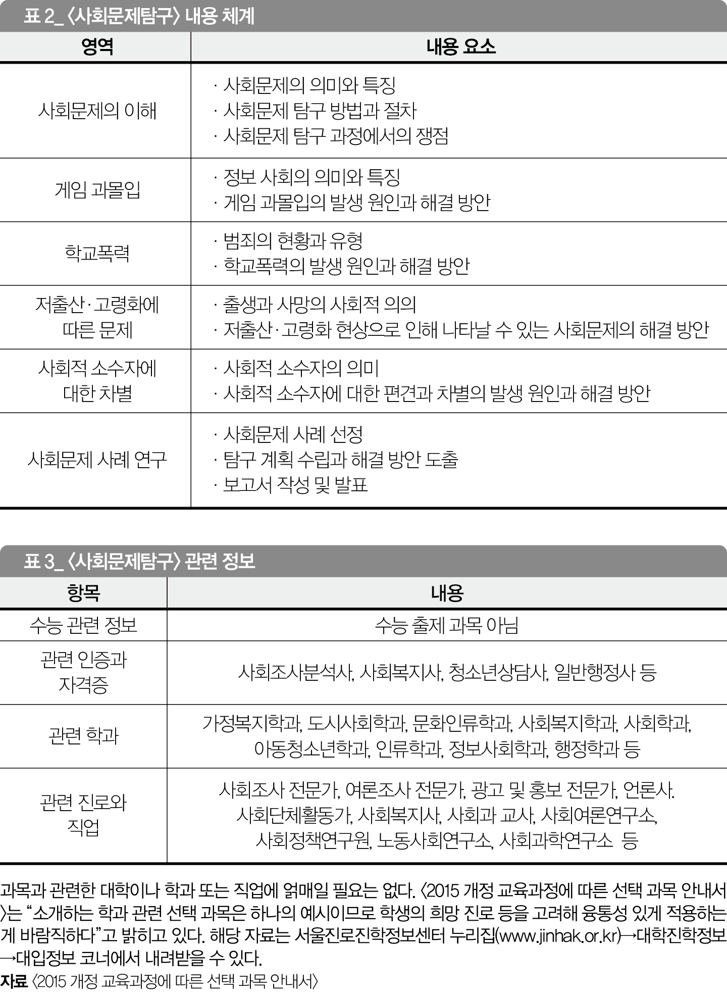<사회문제탐구>는 <여행지리> <고전과 윤리>와 함께 사회 교과 진로선택 과목이다(표 1). 1학년 때 <통합사회>, 2학년 때 일반선택 과목인 <한국지리> <세계지리> <세계사> <동아시아사> <경제> <정치와 법> <사회·문화> <생활과 윤리> <윤리와 사상>을 접한 다음 배우는 것이 일반적이다.