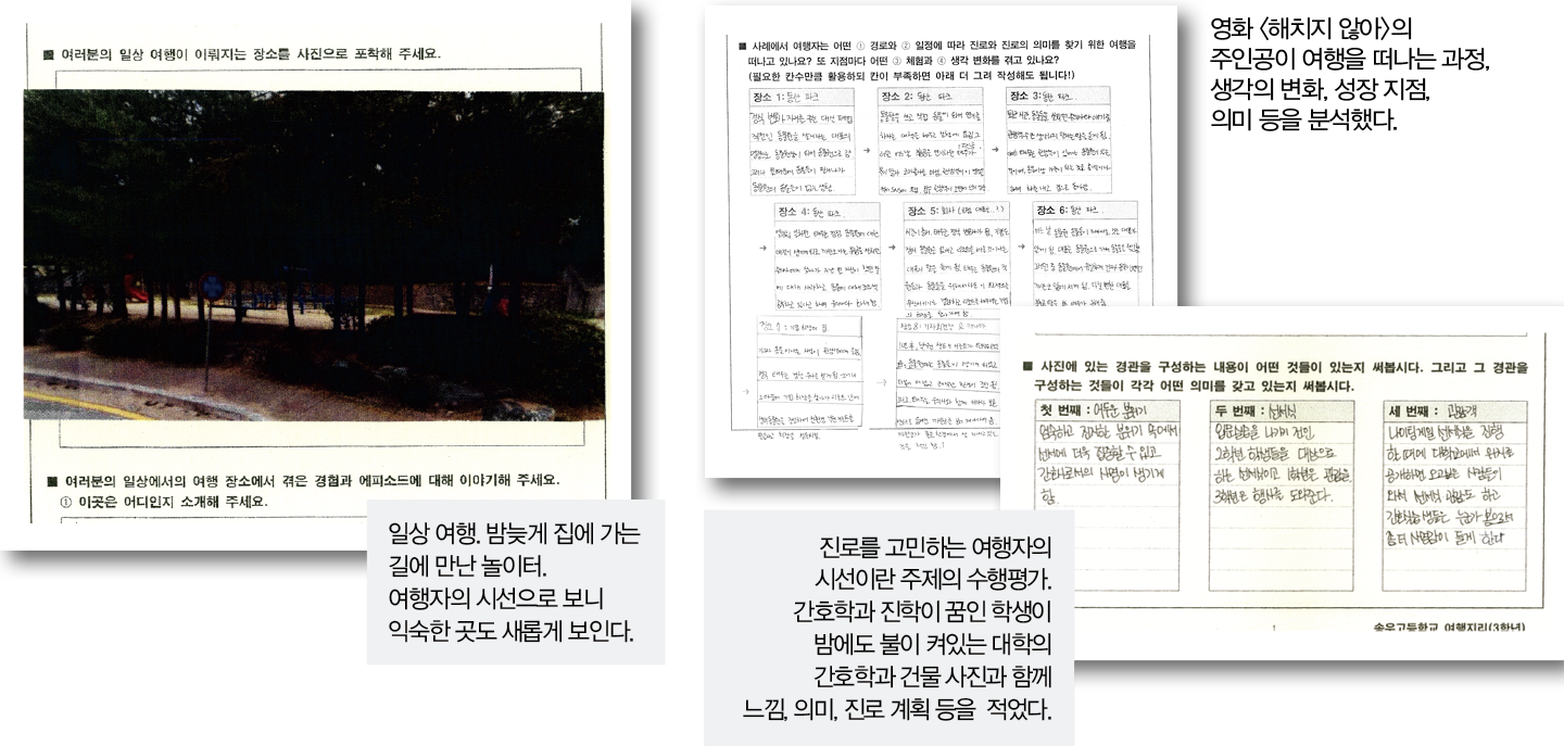 최 교사는 경기 송우고 재직 당시 “책이나 대중매체를 골라 여행을 떠나는 이유 찾기, 여행자의 시각으로 일상공간 바라보기, 자신의 진로와 관련된 장소와 이미지 설명하기 등의 수행평가를 했다. 특히 여행자의 시각으로 일상생활 공간을 바라보며 학생들은 지금껏 느껴보지 못한 새로움을 느꼈던 것 같다”고 전했다.