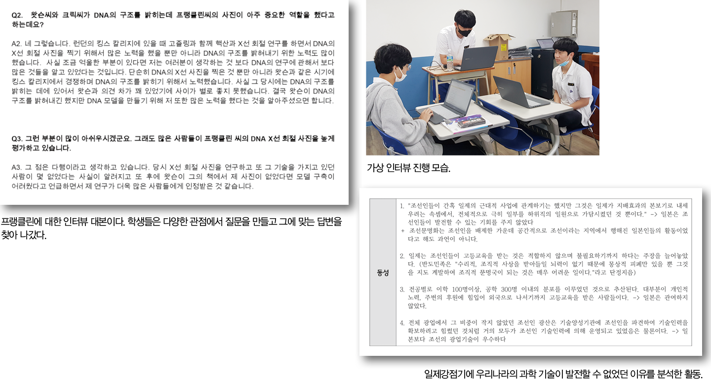 장 교사는 “서양 과학사를 배운 뒤 과학자 가상 인터뷰를 진행했다. 학생들이 과학자를 선정해 인터뷰 질문지와 답변을 작성하고, 발표하는 형태다. 학생들은 과학자의 이론에 대한 피상적인 질문보다는 업적과 관련해 구체적인 내용을 짚고, 현대 과학에 미친 영향 등도 연결해나갔다. 시대와 환경 속에서 과학자의 연구를 바라보고, 자신의 진로 관련 질문을 연결해보는 등 과학자의 일생, 이론을 다양한 시각으로 탐구하는 시간을 가졌다”고 전했다.