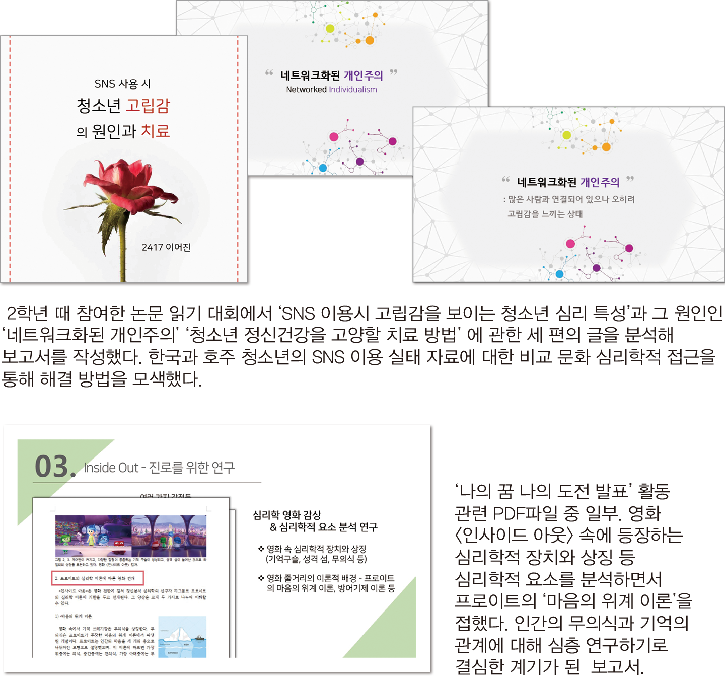 <인사이드 아웃> 속 심리학적 요소를 분석하면서 프로이트의 마음의 위계 이론을 접하고 무의식과 기억의 관계를 심층 연구함. 구글 폼 설문조사를 활용해 수집한 학생들의 의견을 통해 인문학적 의미가 숨어 있는 학교 내 일상적 요소들을 찾아내는 ‘생활 속 인문학’ 프로젝트를 기획해 진행함
