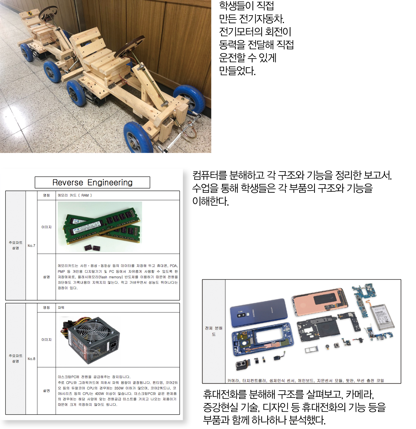 다양한 수행평가 항목이 있겠지만, 대부분은 창의공학설계의 과정에 맞춰 프로젝트를 진행한다. 인공지능 기반의 피지컬 컴퓨팅 프로젝트, 대표적으로 자율주행자동차를 만들었다. 마이크로비트, 아두이노 등을 활용해 주행을 위한 기본 프로그래밍을 설계하고, 장치의 구현을 위한 하드웨어 설계 및 제작을 통해 피지컬 컴퓨팅을 구현한다. 또한 기존 프로그래밍의 한계를 인공지능 기술을 융합해 해결함으로써 창의적 사고와 문제 해결 역량을 중점적으로 기를 수 있다. 우리는 하드웨어와 소프트웨어를 가리지 않고 공학 기술을 구현한다. 내진설계를 통한 초고층 건물 제작 및 지진 실험, 제품을 분해하고 원리를 탐색해 나가는 리버스엔지니어링 등이 대표적이다.
