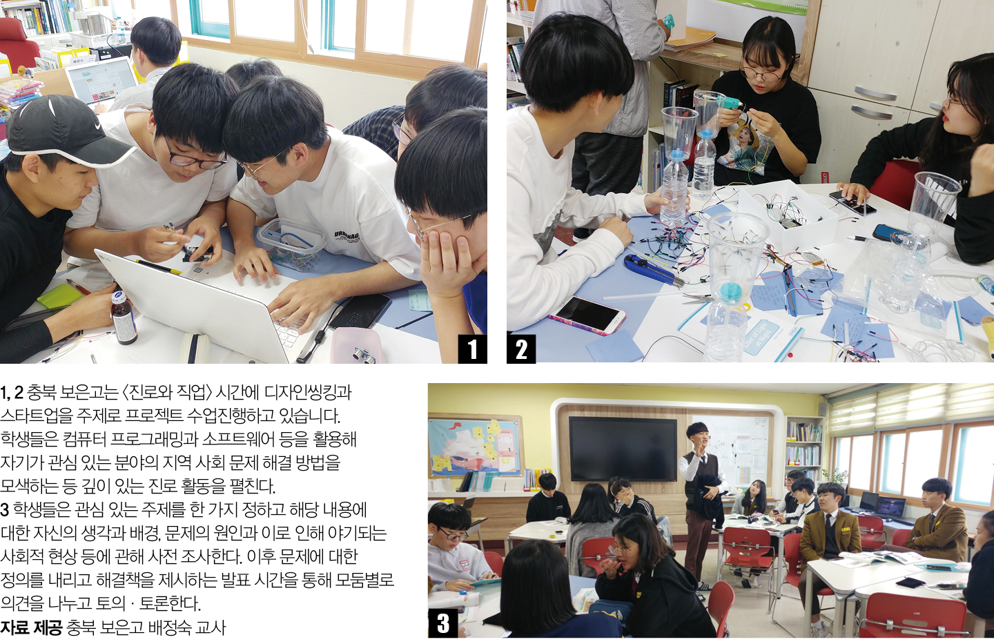 충북 보은고의 <진로와 직업> 수업은 1학년을 대상으로 일주일에 한 번, 2학기에 걸쳐 진행됐다. 충북 보은고 배정숙 교사는 “수업 시작 전 왜 진로 탐색이 중요한지, 시대의 흐름과 변화와 함께 수업의 필요성을 학생들에게 충분히 이해시킨다. 진로 교육의 목표에 맞춰 디자인 싱킹을 비롯해 메이커 교육, 기업가 정신 등 다양한 주제와 교육 방법을 활용해 수업한다. 2, 3학년은 교과가 아닌 창의적 체험 활동의 진로 활동 영역에서 수업을 진행하고 있다”고 소개했다.
