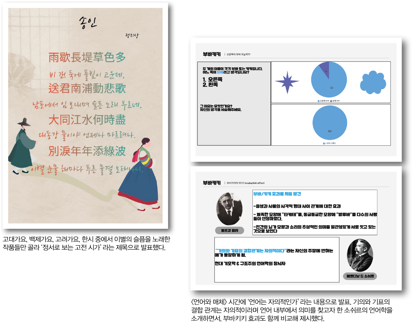 <문학> <제망매가>를 비롯한 <찬기파랑가> <모죽지랑가> 등의 원문에 대해 실질형태소를 훈차, 형식형태소를 음차하는 변용을 적용해 해석해봄. <서동요>를 비롯한 향가 3곡을 현대어로 번역한 후 멜로디와 랩 음악을 입혀 학급 SNS에 공유하며 향가 전도사 역할을 수행함.