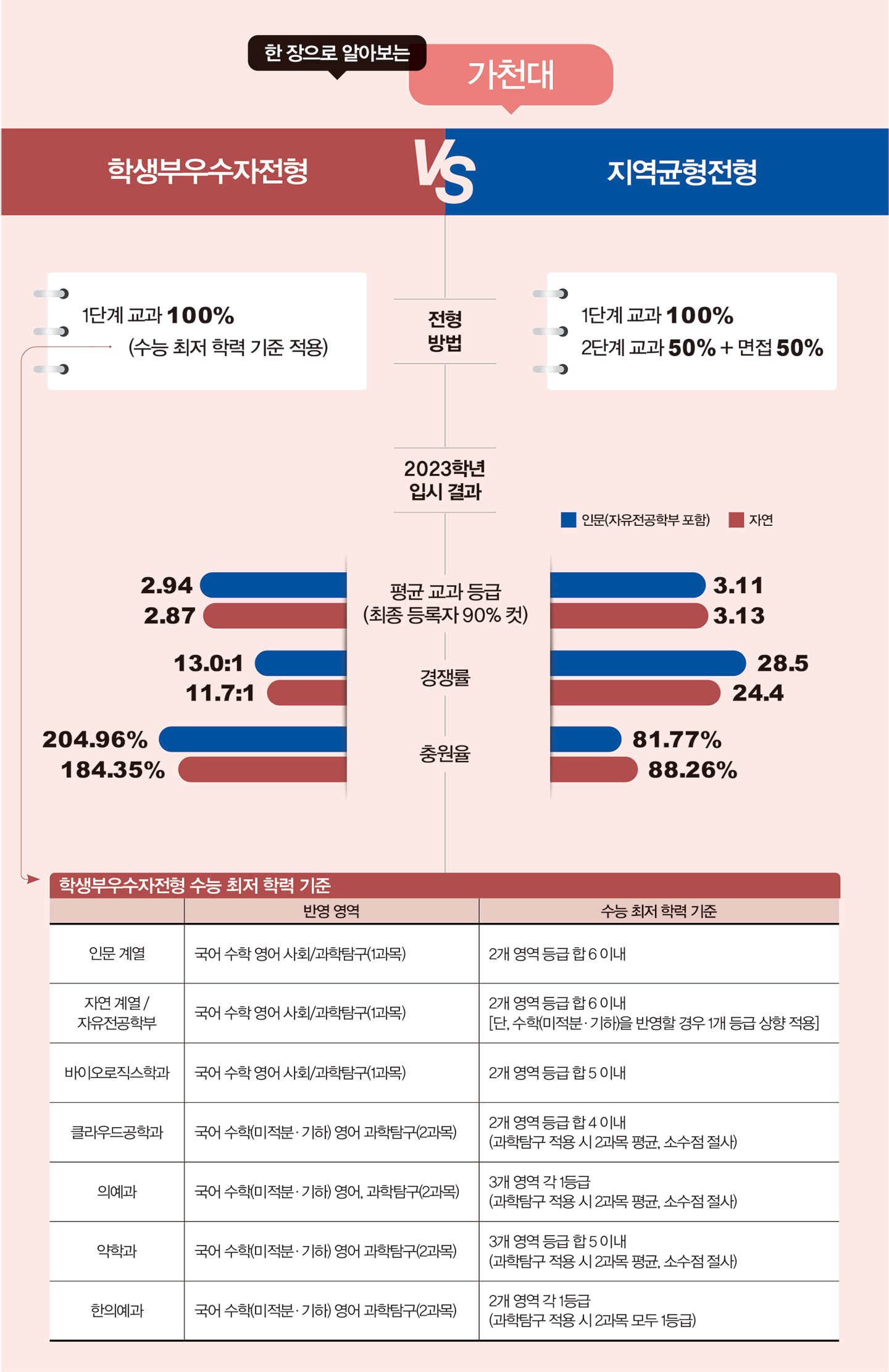 이원화 전형이란, 한 대학에서 동일한 유형 내에서 두 가지로 운영하는 전형을 뜻한다. 같은 학생부교과전형 혹은 학생부종합전형에서 서류형·면접형을 나눠 선발하는 것이 대표적이다. 첫번째로 가천대 교과 전형을 살펴본다. 가천대 교과전형은 학생부우수자와 지역균형, 두 가지다. 두 교과전형은 수능 최저 학력 기준과 면접 유무에 따라 경쟁률이나 충원율이 크게 달라진다.