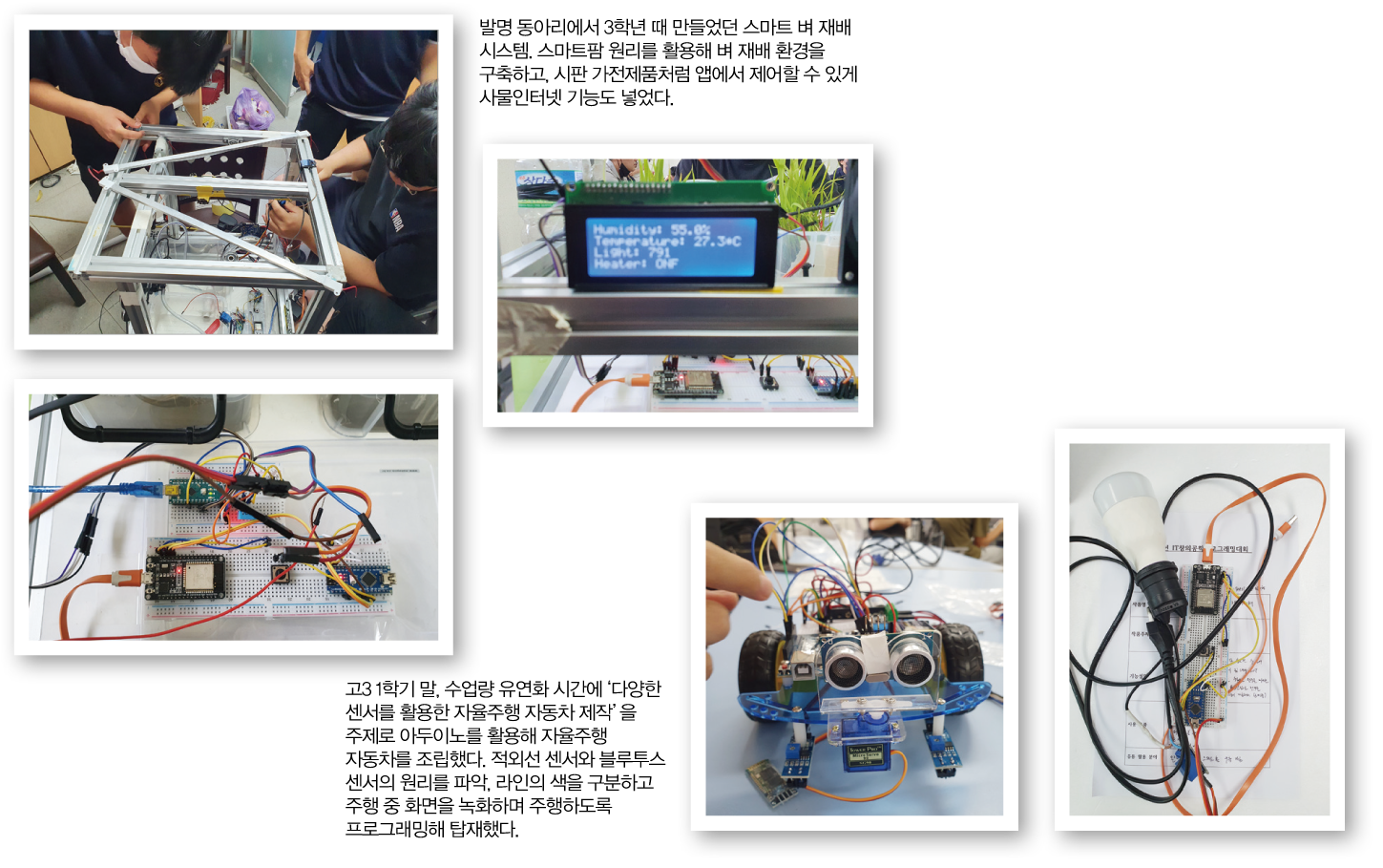 3학년 땐 스마트팜 기술을 차용해 내부는 물론 외부에서도 스마트폰으로 모니터링·조작이 가능한 벼 재배 시스템을 구축했다. 시중 가전제품처럼 앱에 장치를 등록해 사용할 수 있게 한 것. 음성 인식을 통한 조작도 가능하도록 구현했다. “인공 태양 역할을 하는 ‘식물성장LED등’과 수경 재배에 필요한 물 순환이 외부에서도 제어 가능하도록 시스템을 구축해야 했어요. ESP32란 개발 보드를 선택했는데, 사물인터넷이 가능한 임베디드 보드 중 가격·성능이 뛰어나지만 기업 개발 환경에 맞춰져 있어 코딩·개발이 좀 어려웠어요. 자료가 부족해 해외 사이트까지 뒤져야 했죠. 부원들이 대입 준비로 바빠져, 제가 미리 교육 자료를 만들고 실습해본 후 내용을 알려주며 참여하도록 이끌었죠.” 이 경험은 이후 교외 대회 도전으로 이어졌다. ‘미래 모빌리티를 위한 전국 청소년 인공지능 경진대회’와 ‘전국 고교 자율주행 경진대회’에 참가한 것. 수능을 앞두고 예선까지 치르는 팀 단위 대회라 부담스러웠다. 하지만 혼자 쌓아온 프로그래밍 실력을 확인해보고 싶은 마음이 컸다. 자신의 배움과 경험을 공유하며, 친구들과 함께 큰 무대에 도전해보고 싶기도 했다. “AI 학습 모델을 배운 후, 참가자들이 속도 제한 등 100여 개의 도로 표지판을 분류하도록 학습시키고, 이를 활용해 주최 측에서 준비한 여러 종류의 교통표지판을 현장에서 분리하는 인공지능 경진대회, 그리고 라인트레이싱·미로 탈출 등 정해진 코스를 자율주행해 완주하는 자율주행 경진대회였죠.