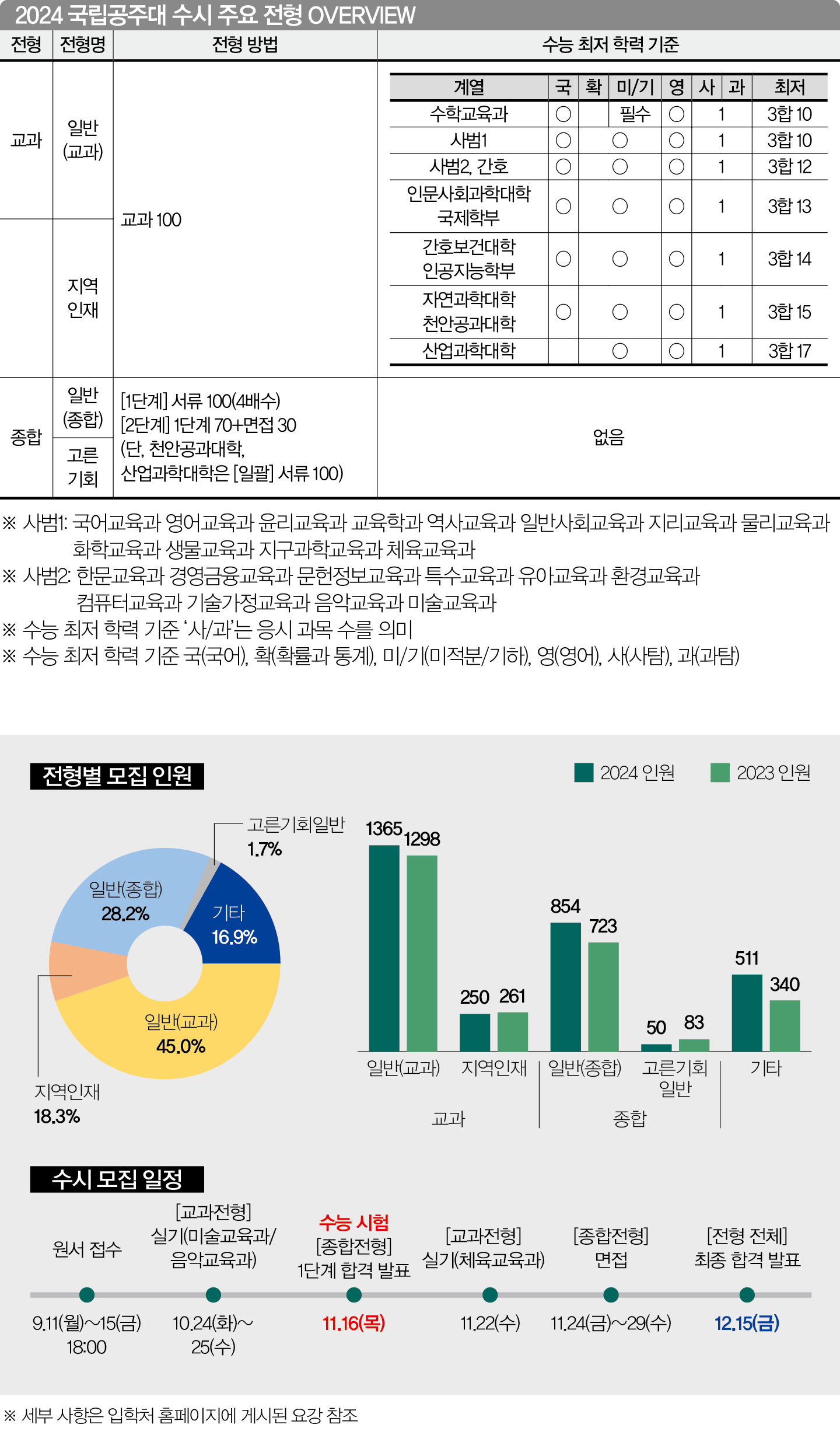 국립공주대는 올해 사범 계열 508명을 포함해 2천815명을 수시로 선발한다. 2023학년과 비교해 수시 선발 인원이 소폭 증가했다. 교과전형은 일반(교과)과 지역인재로 교과 100%를 반영해 선발하며 학과별로 수능 최저 학력 기준이 상이해 반드시 확인해야 한다. 종합전형인 일반(종합)은 모집 단위 중 천안공과대학과 산업과학대학을 제외하고 면접을 포함한 2단계 전형으로 모집한다. 국립공주대 입학본부 임규홍 입학팀장에게 올해 수험생이 주목해야 할 점을 들어봤다.