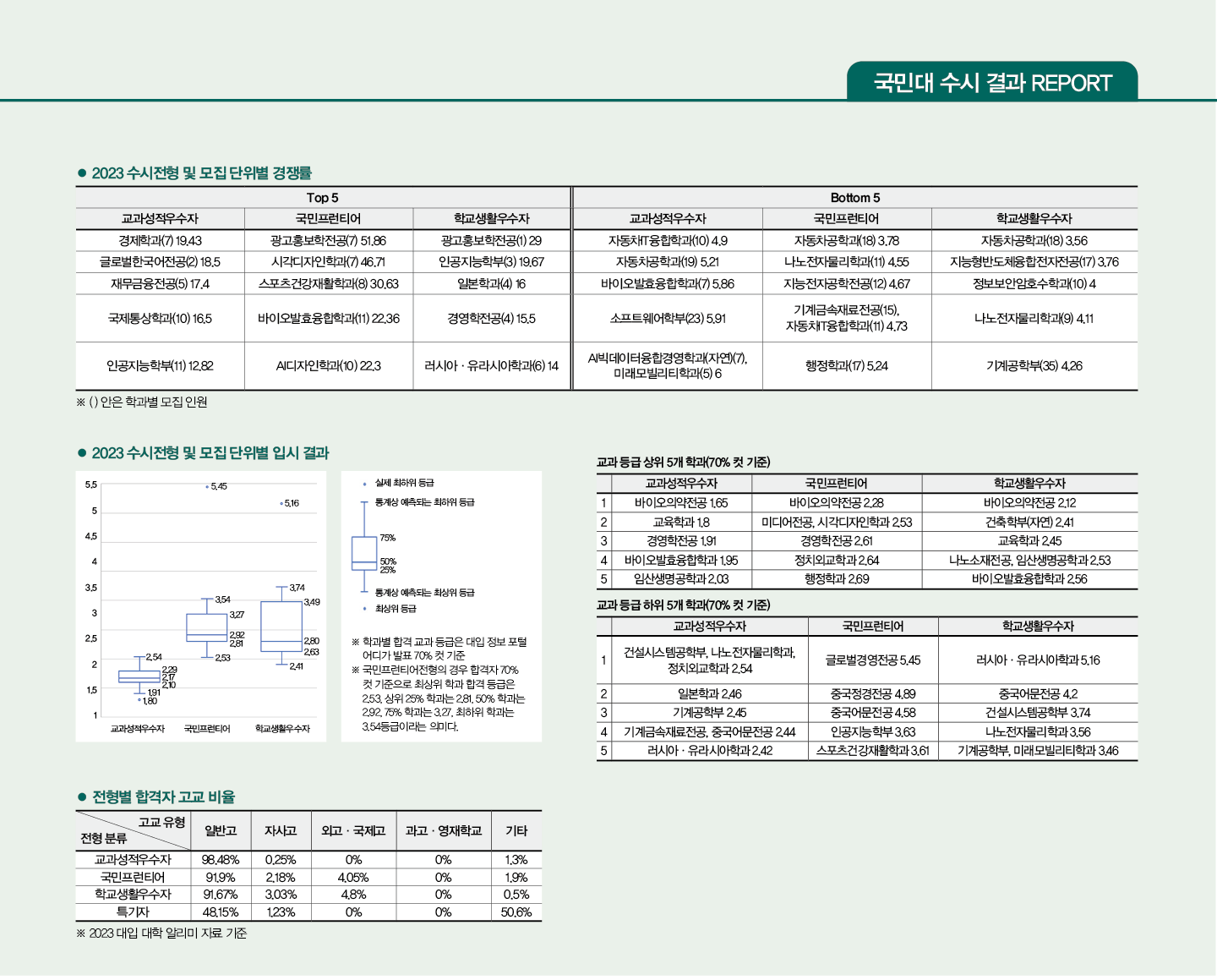 종합전형으로 1단계 서류 100%에 2단계 면접 30%를 포함한 국민프런티어전형과 서류 100%로 평가하는 학교생활우수자전형이 있다. 서류 평가 시 국민프런티어전형은 수업 및 교내 활동에서 드러나는 자기 주도성의 비중이 30%로 가장 높다. 학교생활우수자전형은 진로 탐색과 지원 전공 특성에 맞는 역량을 확인하는 전공 잠재력의 평가 비중이 35%로 가장 높다. 자신의 학생부가 어떤 역량을 주로 보여주고 있는지 판단해 지원 전형을 선택해야 한다. 고교 유형별 합격생 비율에서 일반고 학생의 선발 비중이 타 대학에 비해 높은 점도 특징이다.