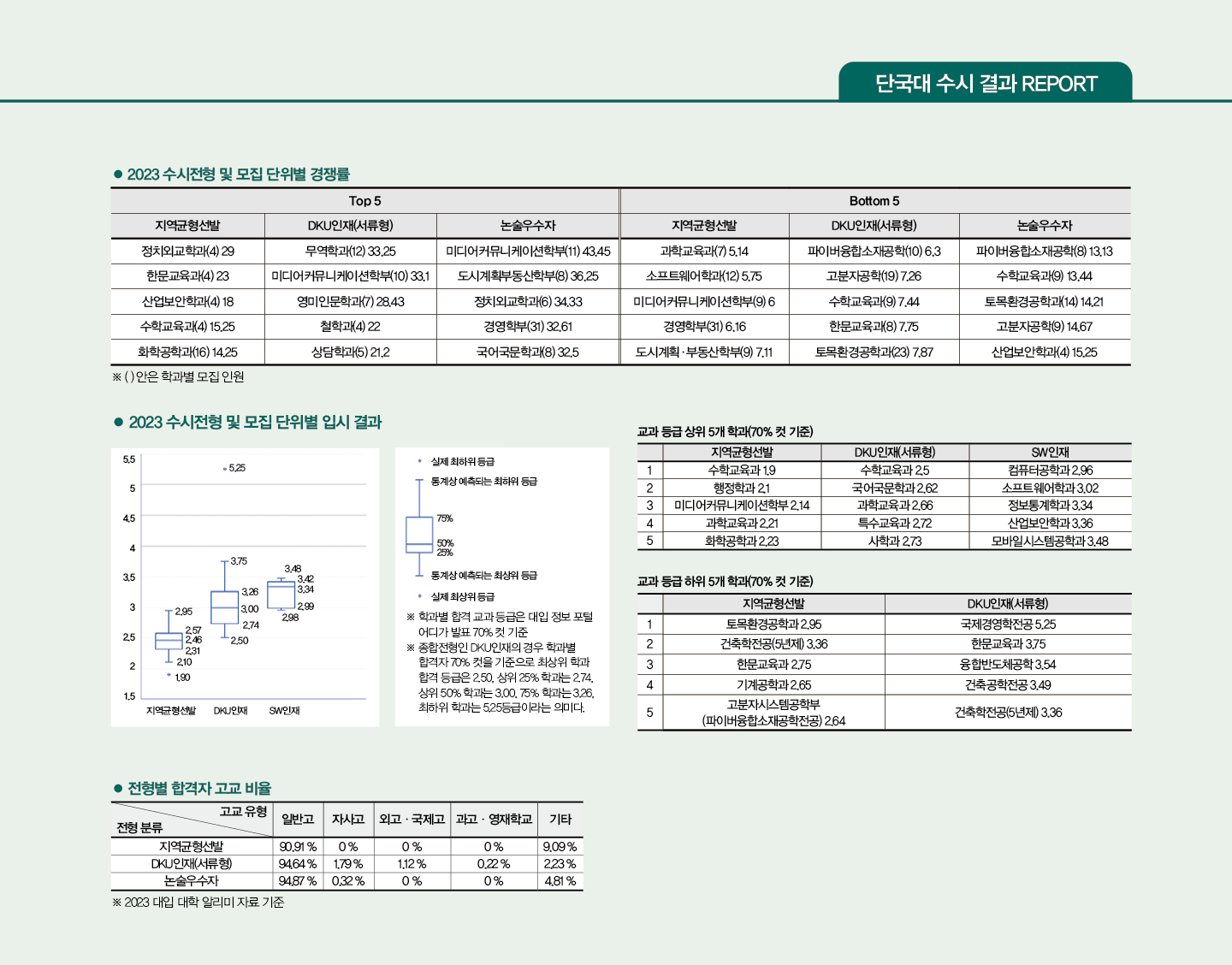 종합전형 최종 합격자의 등급은 죽전캠퍼스의 경우 주로 2~4등급대다. DKU인재(서류형)은 전반적인 교과의 학업 성취도 및 학업 발전 정도, 자기 주도적인 학업 수행 의지와 노력 등을 평가한다. 성실하게 학교생활을 하며 폭넓게 진로를 탐색했다면 지원을 고려해볼 수 있다. 반면 DKU인재(면접형)은 전공 적합성의 평가 비율이 높다. 진로를 확장해나가는 모습, 전공(계열) 관련 선택 과목 이수, 학업 성취도, 전공(계열) 관련 활동의 경험과 노력을 드러낼 수 있다면 지원하길 바란다.