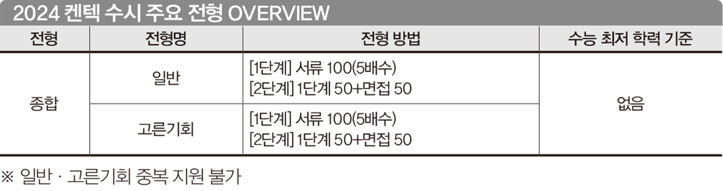 2024학년부터 자기소개서가 폐지됐다. 수험생에게 켄텍 지원 기회를 보다 확대하고, 대학 역시 인재상에 맞는 신입생을 모집할 기회를 확보할 목적으로 더 많은 면접 대상자를 선발하게 됐다. 또 일반전형과 고른기회전형의 경우 지원 자격에 차이가 있을 뿐 평가 방법과 요소는 동일하다. 지난 2년간 두 전형의 경쟁률은 유사했다. 이로 볼 때 전형 간 유불리가 있다고 보긴 어렵다.