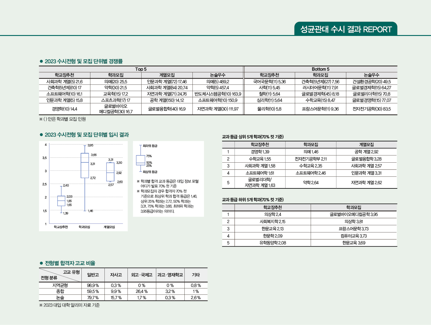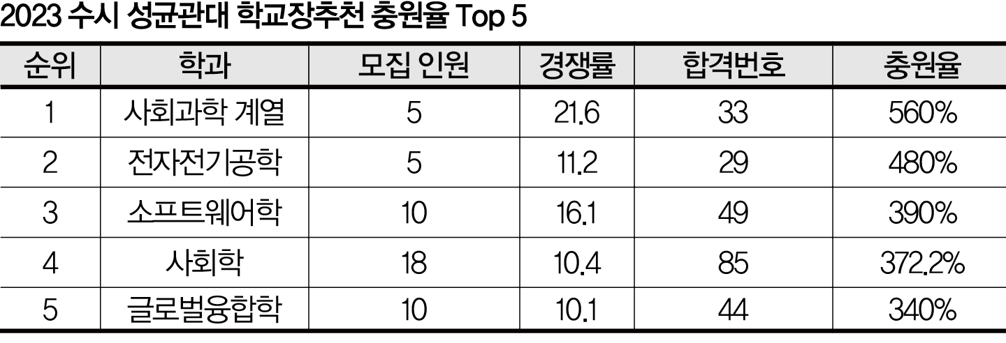 성균관대 학교장추천전형의 특징은 학과별 경쟁률과 교과 성적의 차이가 뚜렷하다는 점이다. 학교장추천전형의 경쟁률은 5.8:1(물리학)에서 21.6:1(사회과학계열)까지 편차가 크다. 대입 정보 포털 ‘어디가’에 공개된 학과별 합격 교과 성적 70% 컷은 1.39(경영학)에서 2.4(의상학)까지 분포한다. 따라서 교과전형을 고려하는 학생은 예년 합격 교과 성적과 지원 시 경쟁률을 살펴보고 학과를 최종 결정해야 한다. 또 수능 최저 기준이 완화됐다는 점, 학과와 계열별 모집 인원에 변동이 많다는 점, 타 대학과 중복 합격이 많아 충원율이 높다는 점도 눈여겨볼 필요가 있다. 종합전형의 경우 계열모집과 대부분의 학과모집에서 서류 100%로 선발한다. 평가 영역과 반영 비율은 학업 역량 50%, 개인 역량 30%, 잠재 역량 20%다. 개인 역량에 교과 성취 수준, 지적 호기심, 관심과 열의 등이, 잠재 역량에 자기 주도성, 성실성 등이 포함되기에 학교생활에서 학습의 내용과 과정, 결과가 중요하다는 것을 알 수 있다. 참고로 올해 입학처 홈페이지에 공개한 <성균관대가 들려주는 고교생활 가이드북>을 살펴보면 준비에 도움이 된다. 면접은 학과모집 중 의예, 사범 계열, 스포츠과학과와 과학인재전형의 전 학과에서 실시된다. 사범 계열과 스포츠과학과 면접에서는 해당 분야 이슈나 시사상식 등이 공통 문항으로 출제되기도 한다.