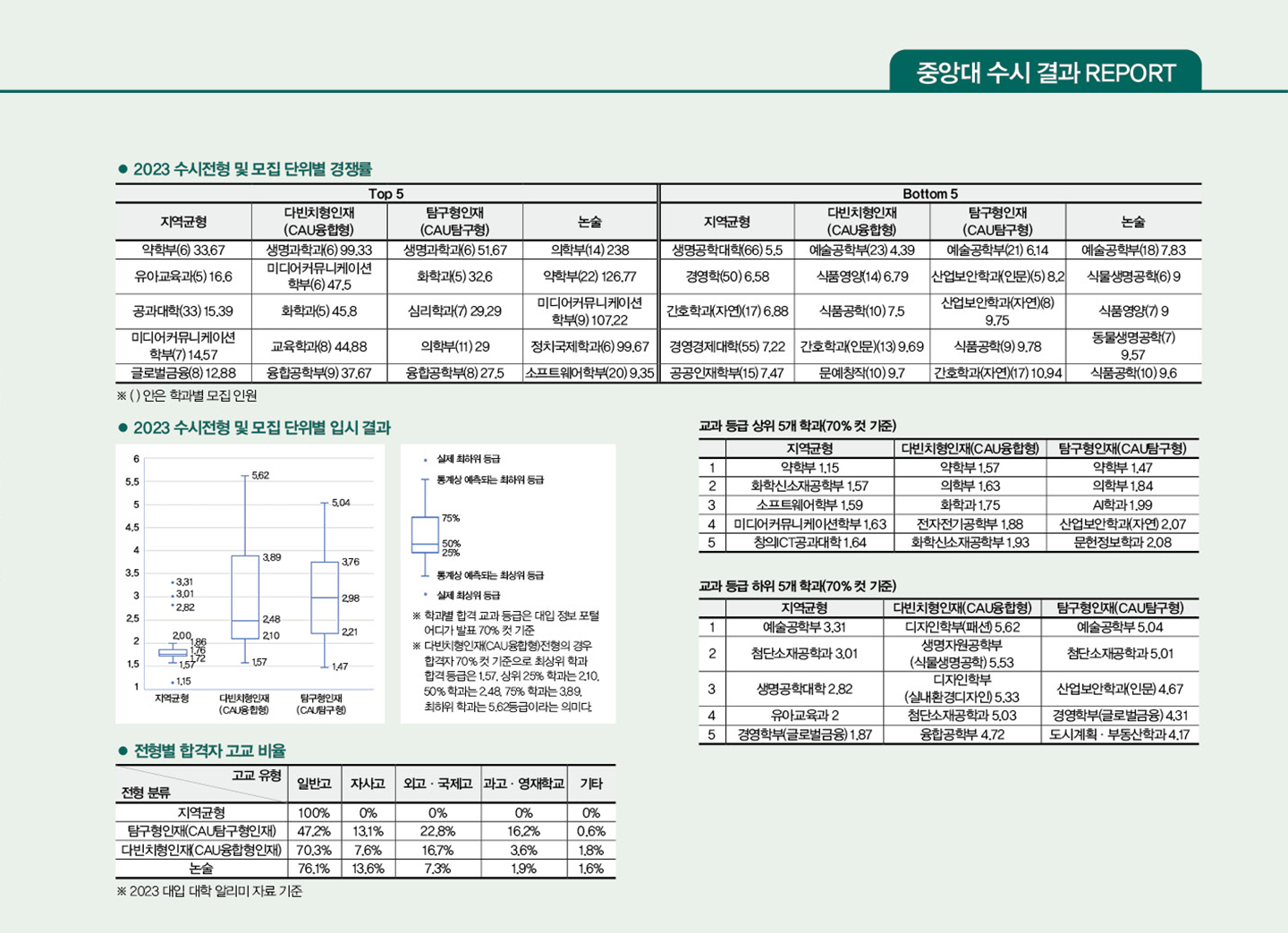 CAU융합형인재전형과 CAU탐구형인재전형 중 선택 시 유의할 점은 우선 두 전형 간 인재상이 다르다는 것이다. 공개한 ‘2024 중앙대 학생가이드북’을 꼼꼼히 읽어보고 어느 전형이 유리할지 판단해야 한다. 두 번째 고려할 점은 전형에 따른 고교 유형별 합격자 비율이다. CAU융합형인재전형의 경우 일반고 합격자 비율이 70.3%인 반면 CAU탐구형인재전형은 47.2%로 차이를 보인다. 대입 정보 포털 어디가에 공개된 70% 컷은 CAU융합형인재 1.47~5.04등급, CAU탐구형인재 1.57~5.62등