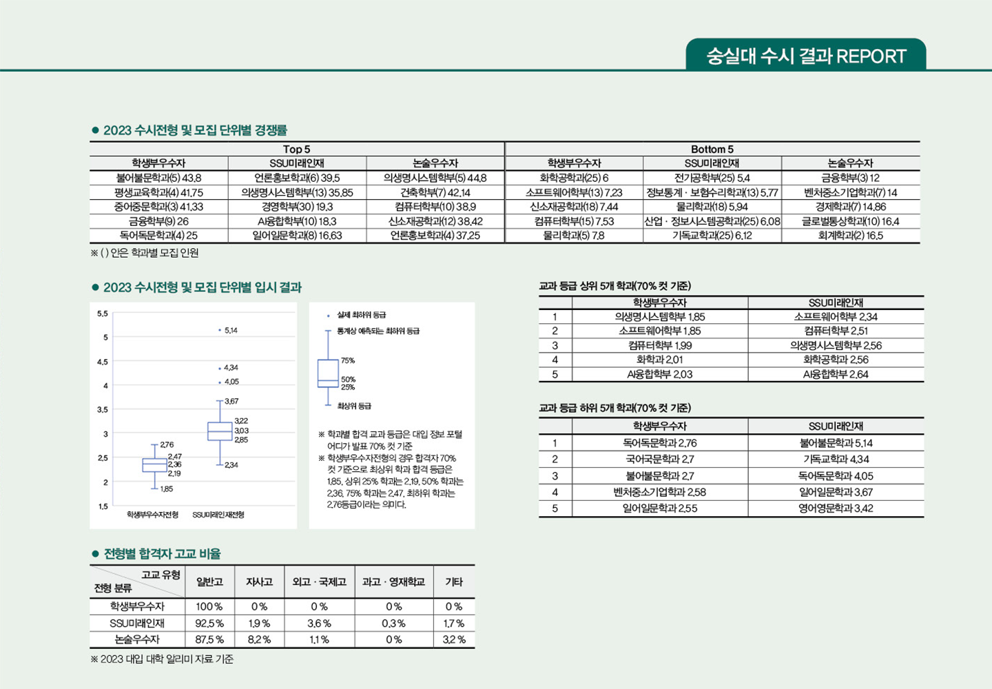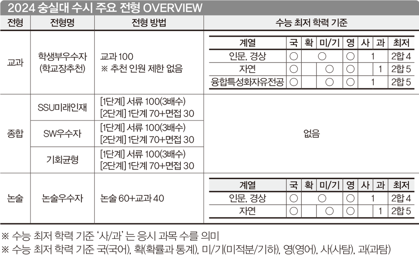 숭실대는 올 수시 모집에서 전형의 큰 틀을 유지하며 1천729명을 모집한다. 학생부교과전형인 학교장추천전형은 인문 계열, 경상 계열 2개 영역 등급 합 4등급 이내, 자연 계열과 융합특성화자유전공학부는 2개 영역 등급 합 5 이내의 수능 최저 학력 기준을 둔다. 자연 계열과 융합특성화자유전공학부는 수능 수학에서 <미적분>과 <기하> 중 한 과목에 응시해야 한다. 학생부종합전형인 SSU미래인재전형은 1단계 서류 100%, 2단계 서류 70%와 면접 30%의 비중으로 지원자를 평가한다.