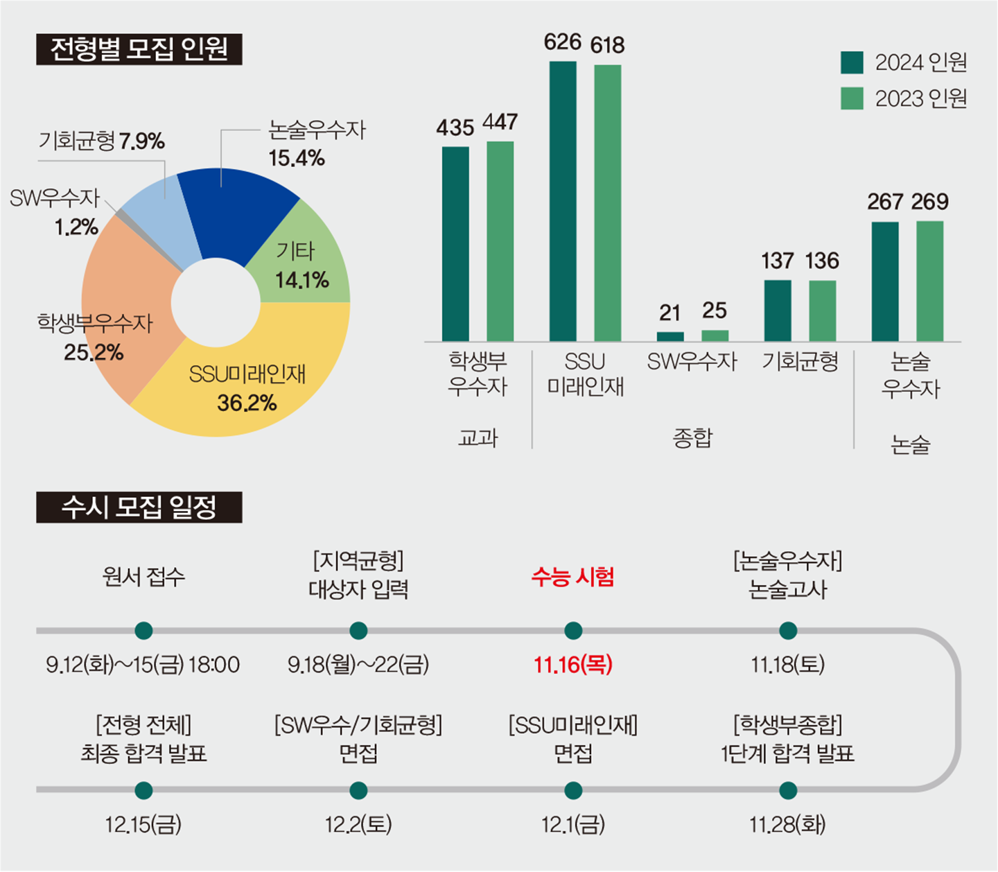 숭실대는 올 수시 모집에서 전형의 큰 틀을 유지하며 1천729명을 모집한다. 학생부교과전형인 학교장추천전형은 인문 계열, 경상 계열 2개 영역 등급 합 4등급 이내, 자연 계열과 융합특성화자유전공학부는 2개 영역 등급 합 5 이내의 수능 최저 학력 기준을 둔다. 자연 계열과 융합특성화자유전공학부는 수능 수학에서 <미적분>과 <기하> 중 한 과목에 응시해야 한다. 학생부종합전형인 SSU미래인재전형은 1단계 서류 100%, 2단계 서류 70%와 면접 30%의 비중으로 지원자를 평가한다.