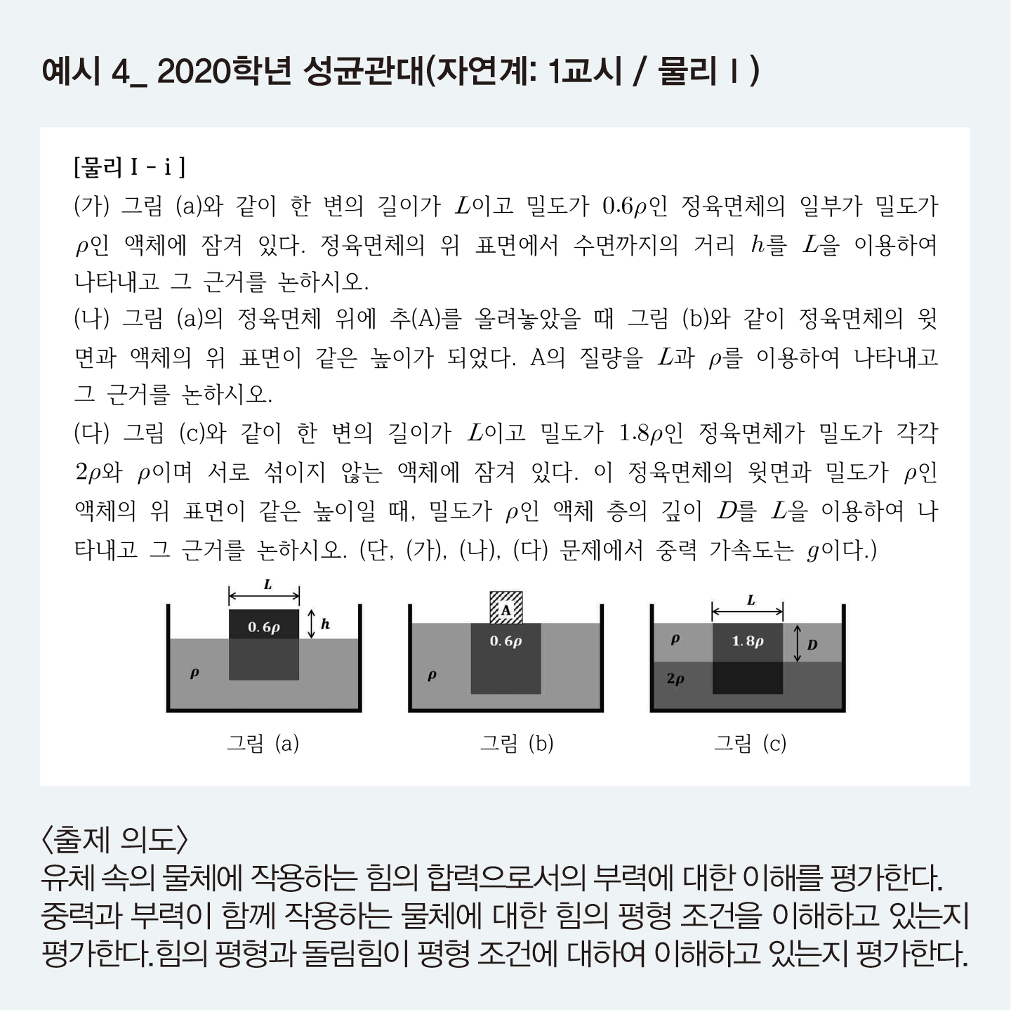 2020학년 성균관대 물리Ⅰ문항(예시 4)은 2015 개정 교육과정에서는 빠졌지만 <물리Ⅰ>을 배운 졸업생들에게는 매우 익숙한 내용이며, 오히려 수능 출제 문항보다 쉽게 느껴질 것이다. 부력과 힘의 평형에 대한 개념을 확인하고 제시된 조건에 맞춰 문제를 푸는 가장 기본적인 유형의 문항이다. 따라서 여러 교과 개념과 연계해 출제한 문항 중 일부로 출제되는 경우가 많다. 출제 의도 세 번째에서 보듯이 실제 역학적 평형과 부력을 연계한 문항이 함께 출제됐다.