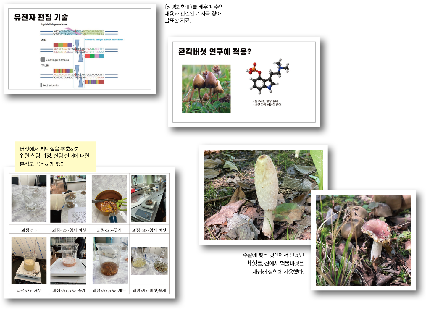 고2~3학년 때 배울 과목은 화학, 생명과학 중심으로 선택했다. <생명과학Ⅱ>시간에 유전자 편집 기술에 대한 내용을 배우면서 우울증 치료제로 효과가 있다고 알려진 환각 버섯의 실로시빈 성분 생산량을 증가시키는 방법을 고민했다.