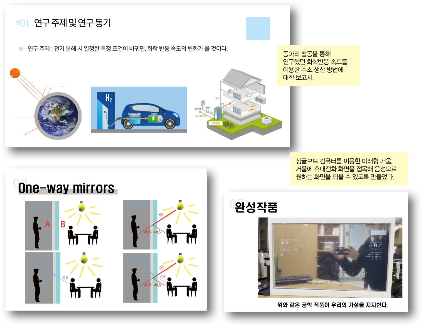 “고1 땐 UV 램프를 활용해 마스크 살균기를 만들었어요. 이땐 아두이노를 활용했고, 고2 때는 라즈베리파이로 디스플레이가 가능한 미래형 거울을 만들었어요. 거울을 보는 시간이 많은 사춘기 학생들이 검색하고 싶은 영상이나 자료를 거울을 통해 볼 수 있다면 좋겠다는 생각에서 출발한 거예요. 인공지능 스피커를 삽입해 말로 원하는 자료를 검색할 수 있도록 코딩했죠.
