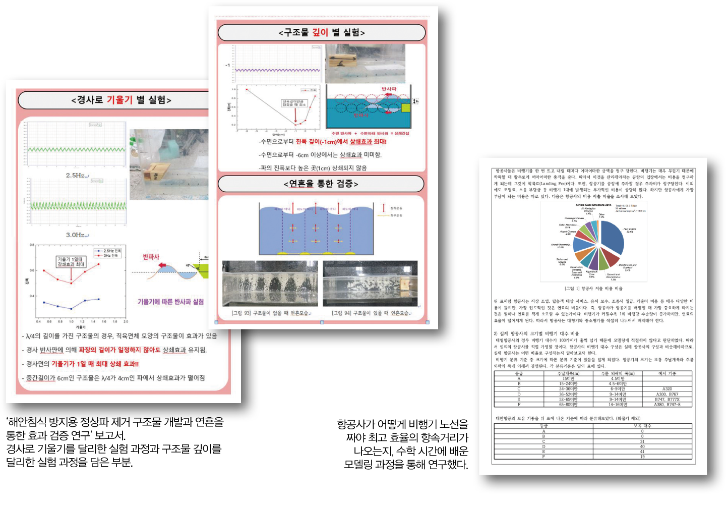 2학년 때도 과제 연구 활동이 있었는데, 보통 주제를 바꿔 진행하지만 이 주제를 좀 더 심화시켜보고 싶었어요. 그래서 1학년 때의 연구 결과를 바탕으로 파동의 성질(상쇄간섭)을 이용한 파도감쇄장치를 연구했습니다.” 파도에 대한 정보를 연흔이라는 척도로 분석하는 아이디어였다. 해안침식이 심각하다는 뉴스를 본 뒤, 파도의 반사파를 이용해 해안침식을 감소시키는 구조물을 구상했다. “정확한 실험을 위해 파도의 진폭과 진동 수를 조절하는 정상파발생장치를 제작했고 구조물 조건을 달리하며 실험했어요. 이 실험을 통해 파도의 감쇄 효과를 최대로 이끌어낼 수 있는 구조물의 길이와 구조물이 물에 잠겨야 하는 깊이를 구해낼 수 있었습니다.