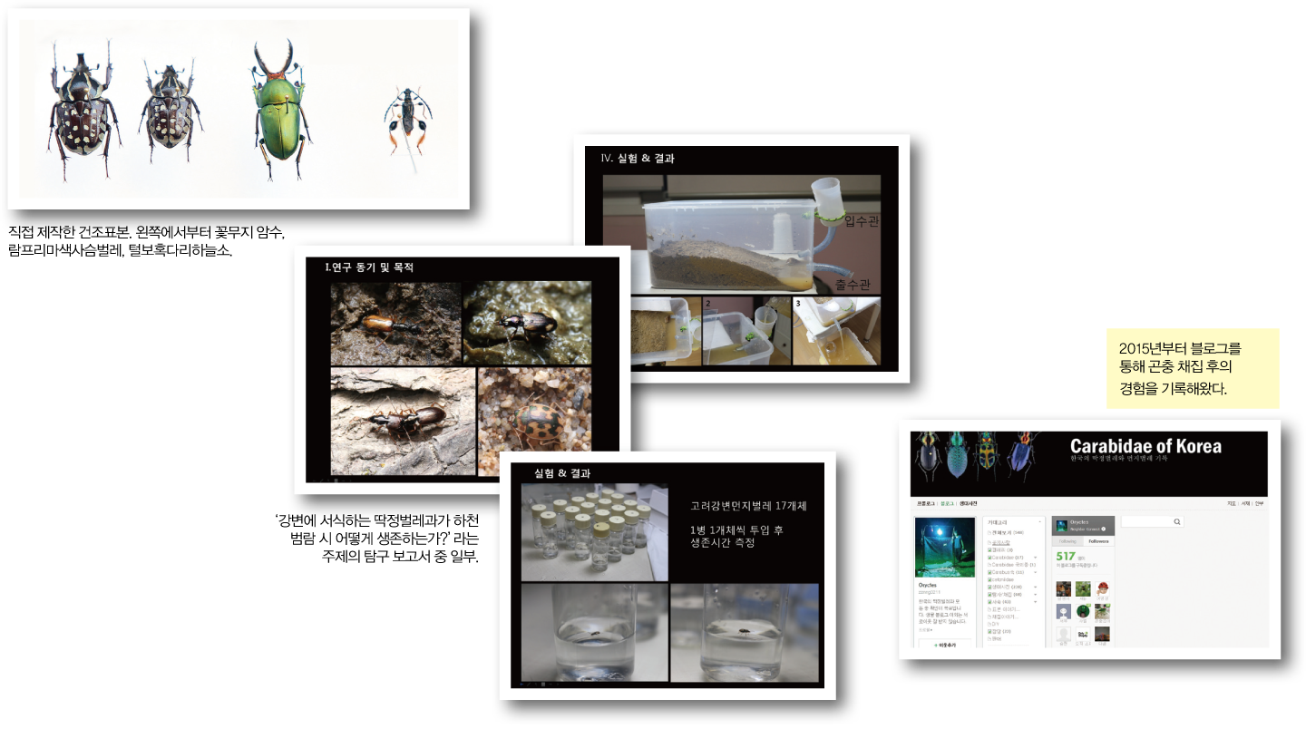 어린 시절, 곤충에 빠져들면서 곤충학자를 꿈꿨다. 꿈은 계속 이어져 고3 때도 틈틈이 딱정벌레과 채집 탐사를 나갔다. 고교에선 생명과학 동아리 활동을 하면서 곤충이라는 개인적 관심사를 이어나갈 수 있었다. 탐사 후의 경험을 기록하고 싶어 블로그를 시작했고, 8년을 넘기다 보니, 그간 찍은 사진과 자료가 꽤 많았다. 많은 사람들에게 딱정벌레과를 알리고 싶은 마음에 동아리 활동과 연계해 블로그에 있는 자료를 모아 도감을 제작했다. 곤충에 대한 관심으로 자연스럽게 학교 생물실에 훼손된 채 보관돼 있던 오래된 곤충 표본에 눈길이 갔고, 1년 반에 걸쳐 표본 복원 작업을 했다.