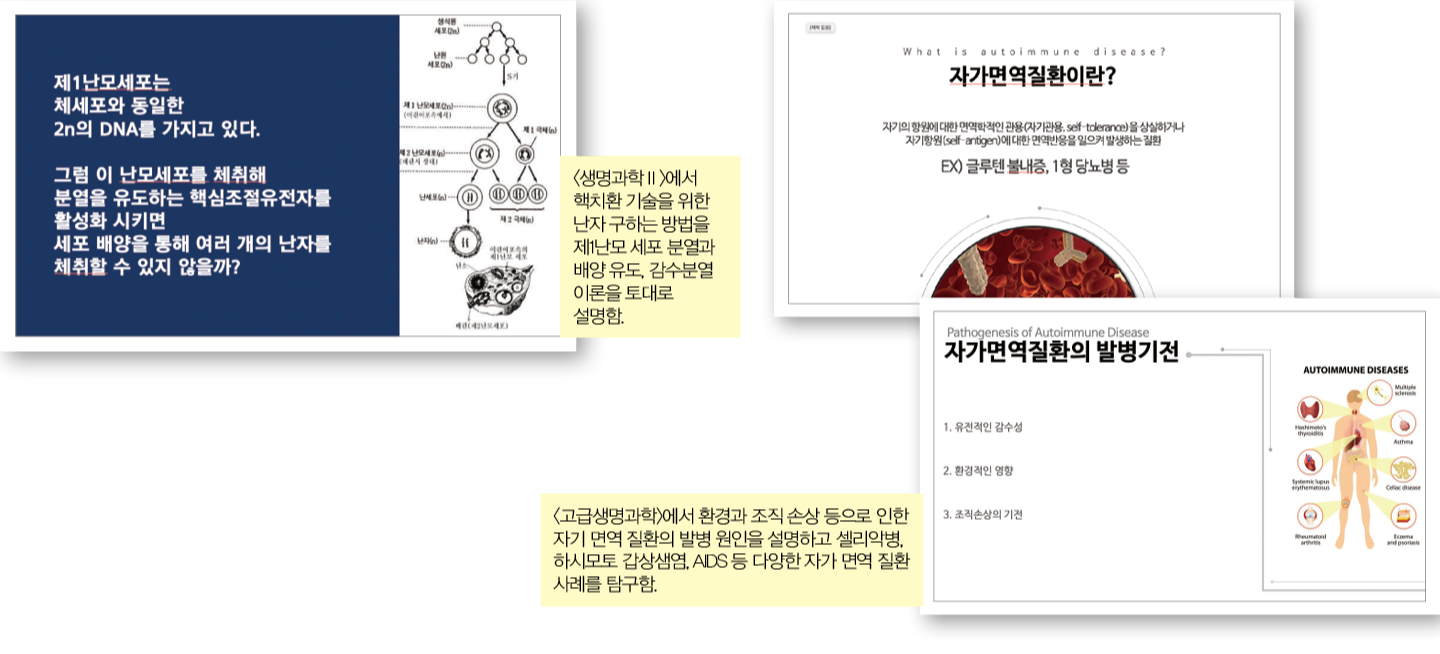 <생명과학Ⅱ> <생명과학Ⅰ>에서 배운 감수분열 이론을 토대로 핵치환 기술을 위한 난자를 구하는 방법에 대해 토의를 진행함 <고급생명과학> 다양한 자가 면역 질환의 발병 원인과 대표 치료 방법을 설명함 <정보과학> C언어 프로그래밍 프로젝트에서 데이터를 통해 약물 재창출 프로세스를 탐구함