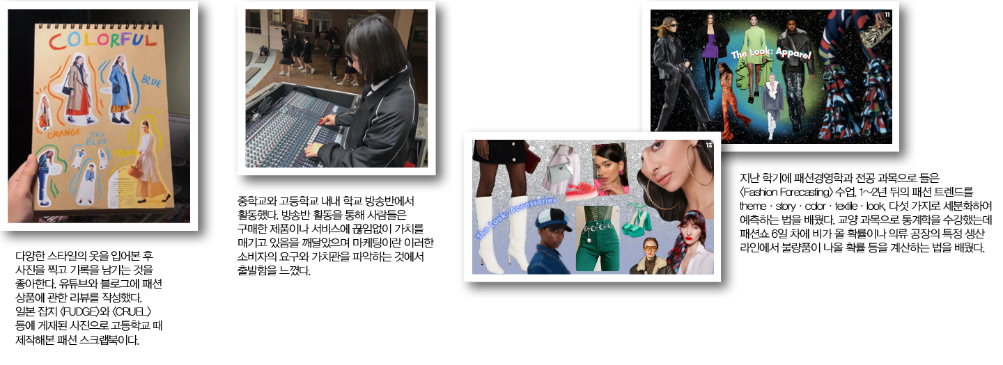 “외할머니와 어머니의 영향이었죠. 옷을 어떻게 조합해서 입으면 좋을까 궁리하는 것이 매우 즐거워요. 또 사람들과 소통하는 것을 좋아해요. 친구들의 마음을 읽고 그에 맞는 아이디어를 생각해내서 앞에서 발표하는 것도 좋아하죠. 그런데 국내에는 패션경영학이라는 이름으로 학과를 개설한 대학이 없더라고요.”