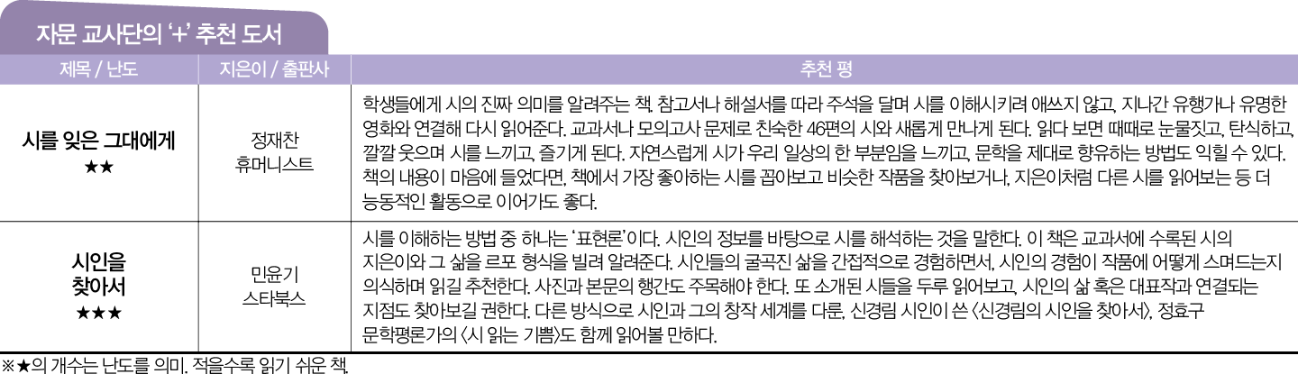 “교과서나 인강으로 배우는 시를 떠올려보세요. 주제, 시어의 함축적 의미와 심상, 운율 등 시의 개념들이 제각기 분절돼 머릿속에만 남지 않았나요? 이 책은 시의 핵심 개념들이 이야기와 어우러져 가슴에 남도록 이끕니다. 앞뒤 문맥과 전체 시상의 윤곽을 파악함으로써 시를 쉽고 제대로 이해하게 하죠. 비평가의 눈으로 깊게 읽는 경험도 제공하고요. 각 시 해설의 핵심인 밑줄 친 문장을 주목하세요. 지은이가 담고자 한 의미를 되새겨보고, 자신이 느낀 것을 설명해보세요. 자신만의 감상이 있다면 글로 남기는 것도 좋아요. 이를 친구들과 함께 나누면 시 감상의 폭이 더욱 넓어질 겁니다.”
