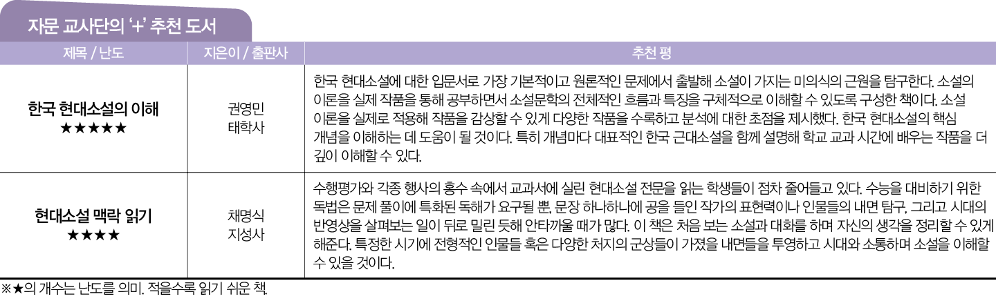 “영화 관람과 소설 읽기는 공통점이 있습니다. 보는 행위 자체만으로도 감동과 여운이 남지만 전문가 평론이 가미되면 이해의 폭이 넓어지고 깊은 울림이 더해진다는 거죠. 이 책은 각 소설이 지닌 역사적 배경과 작가 고유의 성향, 글쓰기 기법 등 작품을 둘러싼 맥락을 안내함으로써 의미와 주제를 곱씹어보게 합니다. 교과서에 수록됐고 또 앞으로도 수록될, 그리고 계속해서 시험에서 다루어질 주옥같은 우리 단편소설 50편을 엄선해 소개한 만큼 유사한 시대의 다른 작품을 읽는 데도 도움이 될 것입니다. ‘소설을 통해 시대를 읽는다’는 명제에 대해 지은이는 ‘현실을 직시하고 지금보다 나은 삶의 가능성을 탐색하는 것’이라고 설명합니다. 각 작품 속 등장인물들이 추구했던 삶과 그들이 바라며 노력한 결과가 현재 우리에게 어떤 영향을 미쳤는지 생각하며 읽어보길 바랍니다.”