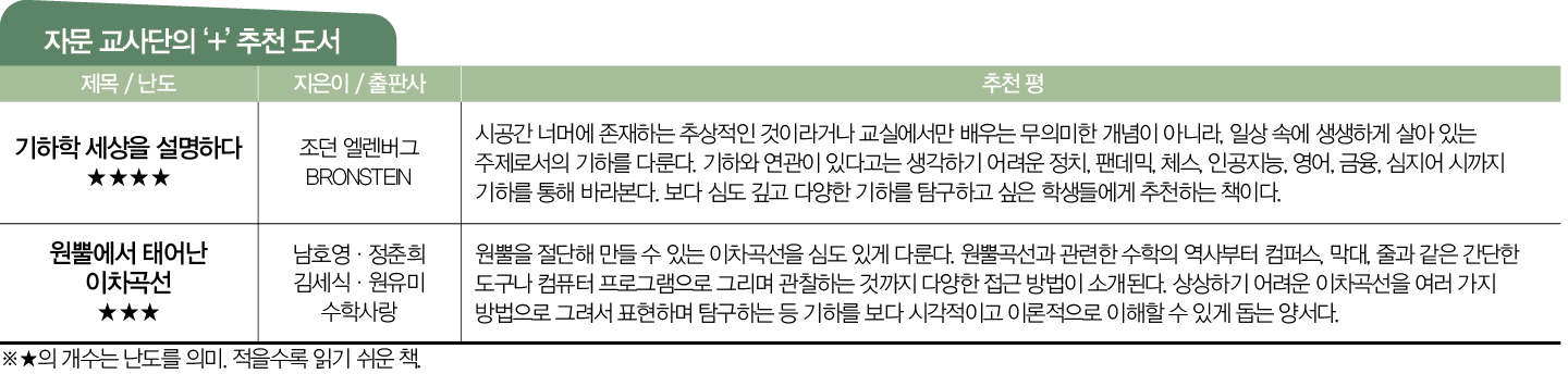 “중·고등학교 수학 교과서 속 개념과 원리를 실험으로 풀어낸 책입니다. 수학을 ‘자연과학의 언어’로 소개하며 수학적 지식을 암기 대상이 아닌 다양한 실험을 통해 이해할 수 있는 개념으로 받아들이게 하죠. 특히 <기하>는 장구한 수학의 역사 가운데 초기 단계에서 정립되고 발전된 기하학을 배우는 과목입니다. 진로선택 과목이지만 평면과 공간에서의 도형을 다루는 과정에서 지각 능력과 더불어 추론 능력을 길러주죠. 건축물은 물론 옷을 포함한 상품 디자인에도 기하적 개념이 기본이 된다는 사실, 알고 있나요? 3D 프린터로 입체 물품을 제작하고 애플리케이션과 컴퓨터 프로그램을 이용한 산업 디자인이 각광받는 지금, 기하적 관점에서 수학을 탐구해보길 바랍니다.”