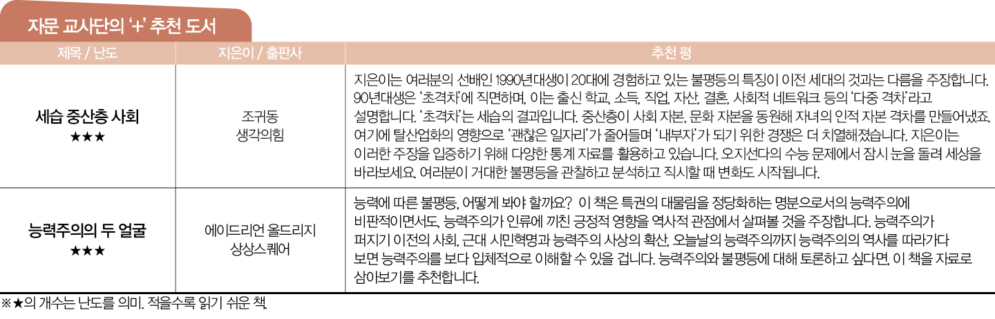 이 책은 특히 ‘현상’에 매몰되기 쉬운 사회 문제의 본질에 다가가는 법을 알려준다. 관심 분야 사회 문제를 깊이 들여다보거나 코로나19가 불평등을 어떻게 심화했는지 분석·토론해보는 활동으로 이어간다면 사회를 바라보는 깊은 시각을 얻을 수 있을 것이다.