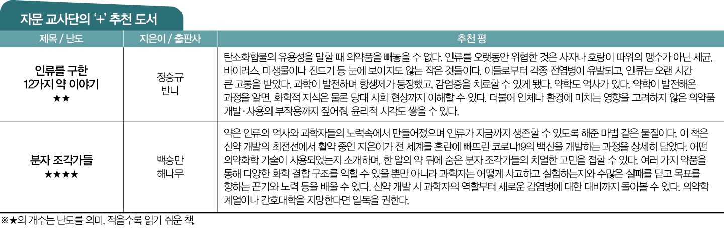 이 책은 우리의 문명을 ‘탄소 문명’이라고 불러요. 의식주부터 DNA까지 일상생활에서 접하는 많은 물질이 탄소로 이루어져 있다는 점에 주목하거든요. 책에선 탄소가 현대 사회의 근간이 되는 원소라고 설명해요. 탄소화합물의 유용성을 인류의 ‘생명’ ‘정신’ ‘에너지’의 차원에서 들여다보죠. 탄소는 우리 몸을 구성하며 생명 활동을 가능케 했고, 인류의 발전을 이끌어 우리의 정신을 만들었어요. 또 석유처럼 유용한 에너지원이 돼주었고요. 책을 통해 탄소의 영향력을 과거부터 현재까지 흐름에 따라 알아갈 수 있어요. 탄소의 양면적 성격에 대해서도 배우고요. 또 신체 내에서 탄소와 결합하는 물질에 대한 이야기도 담겨 있기 때문에 사람에 대해 폭넓게 이해할 수 있어 도움이 돼요. <화학>이나 <생명과학>을 공부하는 후배들에게 추천해요.