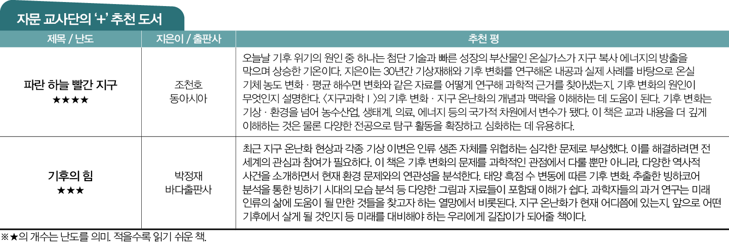 “<지구과학Ⅰ>의 대기학, 기상학 분야는 실제 관측 자료를 바탕으로 한 자료 해석 능력과 자연 현상 간 상호 작용을 이해하고 앞으로의 변화를 추측·예상하는 능력을 다룹니다. 전 세계적으로 관심이 큰 지구 환경 변화와도 관련 깊죠. 생소한 과학 용어가 많고,실제 자연 현상을 관찰한 자료에 대한 분석적 사고력이 필요해요. 이 책은 우리가 직면한 기후 변화와 생명 멸종에 대한 경고를 무섭지만 흥미롭게 풀어놓았습니다. 기온이 1℃에서 6℃까지 상승하는 동안 단계별로 일어날 수 있는 현상을 과학자의 시선에 기반해 쉽게 풀어줍니다. 책을 읽고 기후 변화가 지구 환경과 생명체에 미치는 영향에 대해 고민해보면 좋겠습니다.”_ 자문 교사단