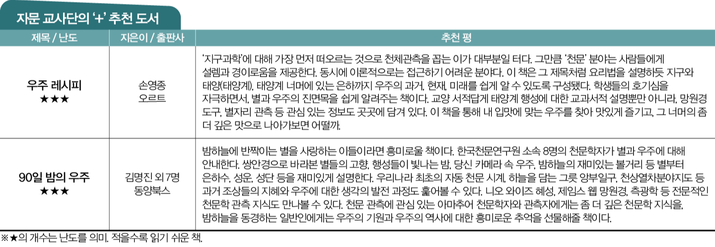 천문학에 관심 있는 후배들은 너무 전공 관련 분야만 파고들지 말고 다양한 도서를 읽으며 다채로운 시각을 접하길 권해요. 특히 소설, 그중에서도 우리말로 된 한국 현대소설은 읽기 쉽고 상상력을 자극해 학업 부담도 낮춰준다는 점을 참고하면 좋겠어요.