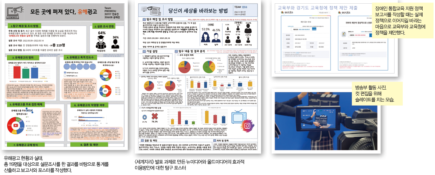 <심화영어Ⅰ> 한국의 정치 양극화 문제, 간접 민주주의의 한계와 미디어의 역할을 설명함 <사회문제탐구> ‘기업의 후원 유무와 저질 포털 뉴스 생산의 관계’를 주제로 탐구 활동을 진행하고 발표함 <사회·문화> ‘스마트폰 이용 시간과 10대의 문해력’을 주제로 양적 연구를 진행함 <언어와 매체> PD가 되어 매체에서의 혐오 표현을 방지하고 형성적 규제에 힘을 싣겠다는 포부를 밝힘 <확률과 통계> 유해광고에 대해 119명을 대상으로 온라인 설문조사를 실시한 후 산출물을 제작하고 발표함